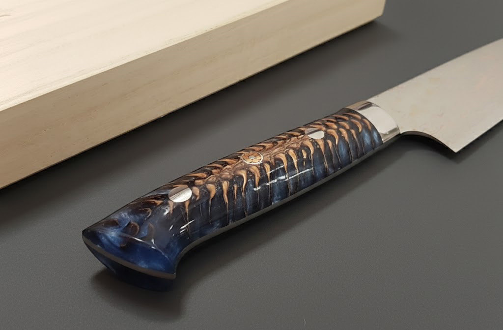 就像原廠的越前內刃(「越前錘鍛刀」)一樣,佐治武士大師的訂製菜刀採用傳統技術錘鍛而成,具有美觀、有力的外觀和具有高洛氏硬度的刀刃。