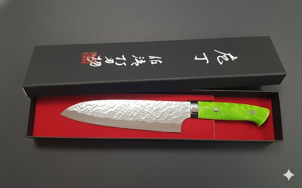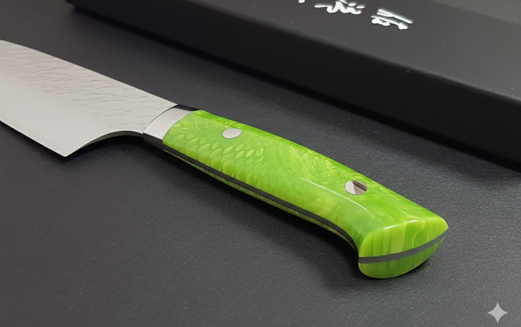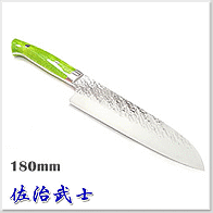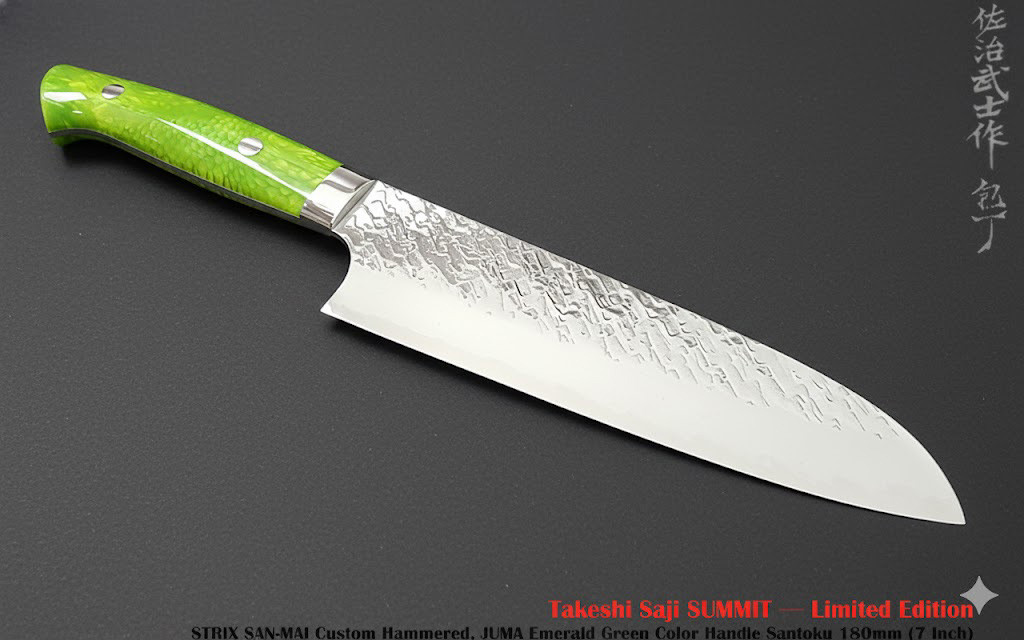 佐治武士 Takeshi Saji SUMMIT - 限量版訂製系列- 祖母綠色JUMA®聚脂柄錘紋三德刀 -SPG STRIX 粉末夾鋼錘紋-180mm