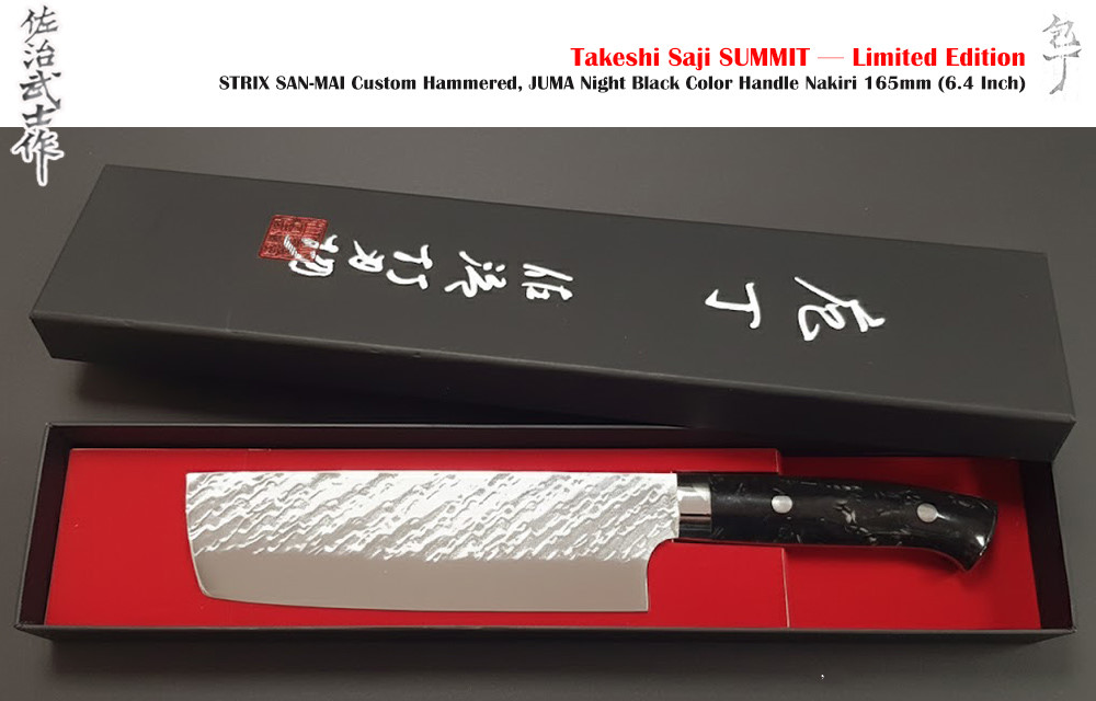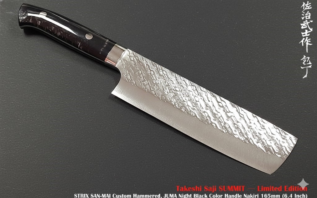 佐治武士 Takeshi Saji SUMMIT - 限量版訂製系列-黑色JUMA®聚脂柄 Nakiri 錘紋菜切刀 - SPG STRIX 粉末夾鋼錘紋-165mm