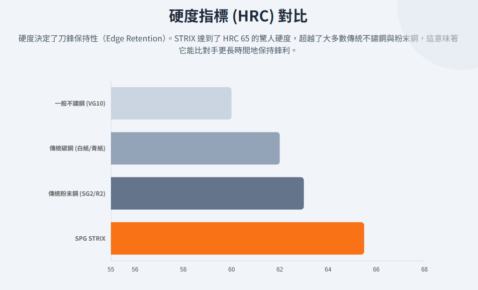 ●STRIX鋼材硬度極高(HRC 65),鋒利度和刀刃保持性都非常出色。此外,即使硬度如此之高,STRIX鋼材也易於重新磨利,並且與SG-II鋼材(也稱為R2鋼材)類似,具有極佳的防銹性能。