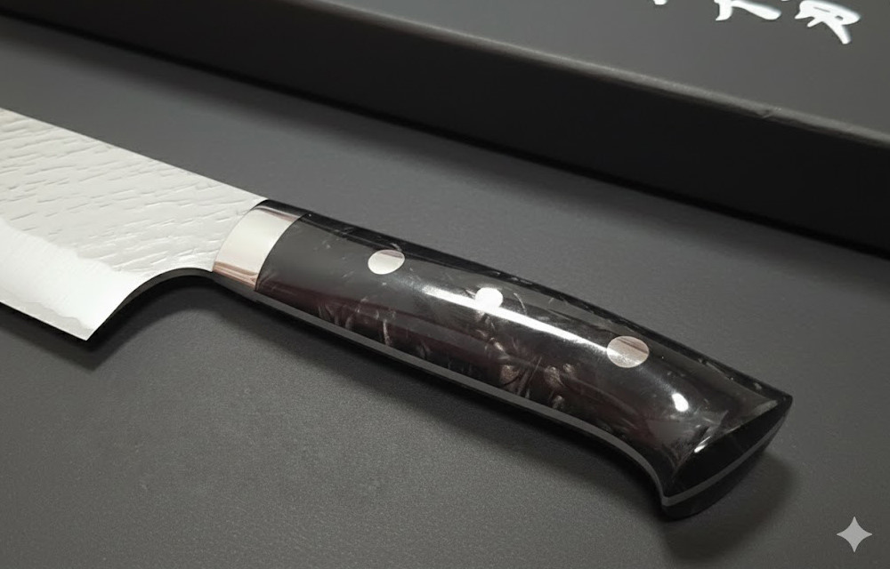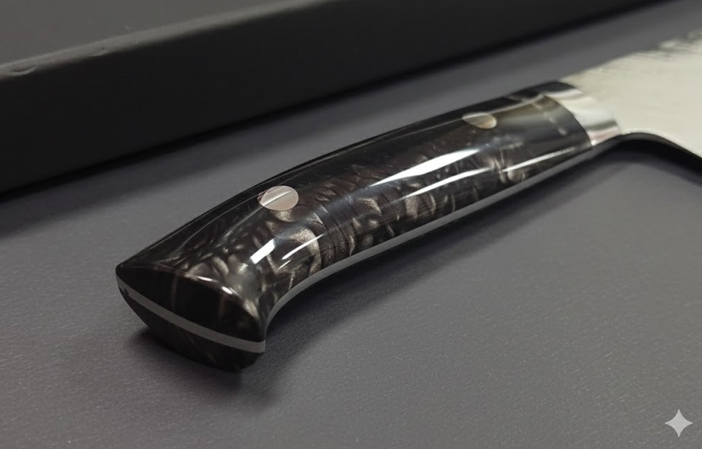 這款獨具匠心的JUMA訂製手工「夜黑」手柄外觀精美,為確保握持舒適,經手工精心打磨拋光。此外,還配有不銹鋼護手,以提升刀具的耐用性和刀身平衡性。