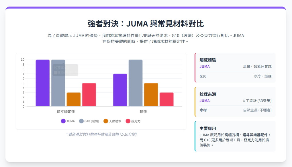 它是一種高密度、耐用的聚合物樹脂,以其生動的圖案、濃鬱的色彩和光滑奢華的表面而備受讚譽。 JUMA擁有類似象牙或牛角的溫暖而堅實的觸感,同時保持穩定,並能抵抗潮濕和溫度變化。