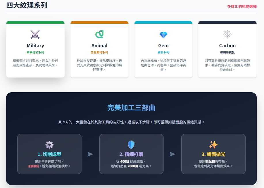 ●稀有而時尚的「JUMA夜黑」材質。 JUMA是一種高檔的現代原料,專為手工藝術品而設計。 JUMA是一種樹脂基材料,具有極佳的耐用性,並能呈現出非常美觀且引人注目的外觀(如龍鱗)。我們立即請求佐治武士大師使用這種特殊材料製作他的限量版刀具,如今,佐治SUMMIT限量版訂製系列刀具的又一傑作問世了 。