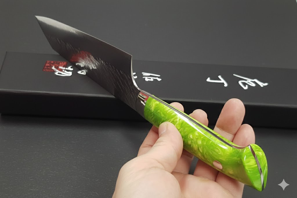 這款獨具匠心的JUMA訂製手工「祖母綠色」手柄外觀精美,為確保握持舒適,經手工精心打磨拋光。此外,還配有不銹鋼護手,以提升刀具的耐用性和刀身平衡性。