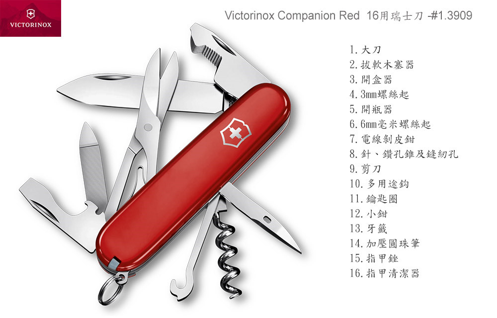 探索能隨時準備助您完成各種任務的日常拍檔。Companion 的口袋尺寸小巧精緻,設計精簡流麗,配備 16 種實用功能,包括螺絲批、創新的開箱器和剪刀,是最極致的袋裝刀。 Companion 結合了瑞士製造的精準度與精巧的經典設計,將 Victorinox 的願景濃縮其中,助您輕鬆享受時尚實用的生活。