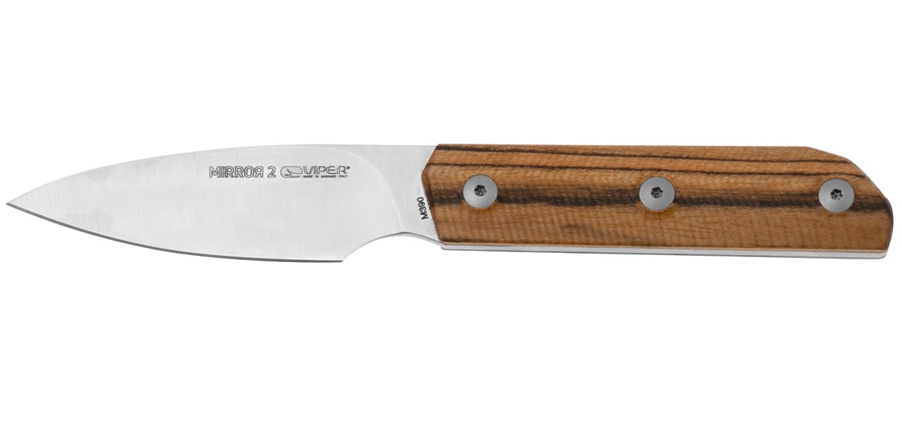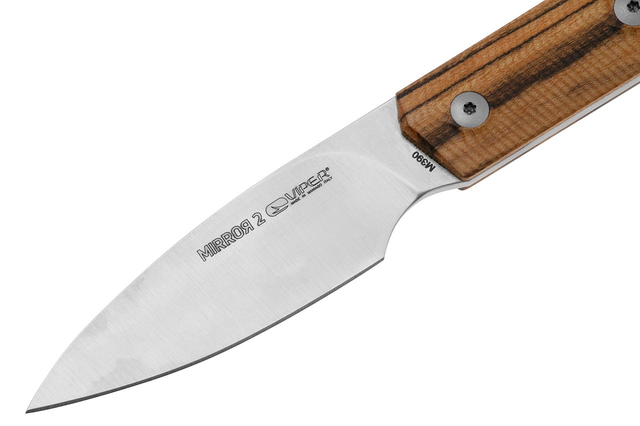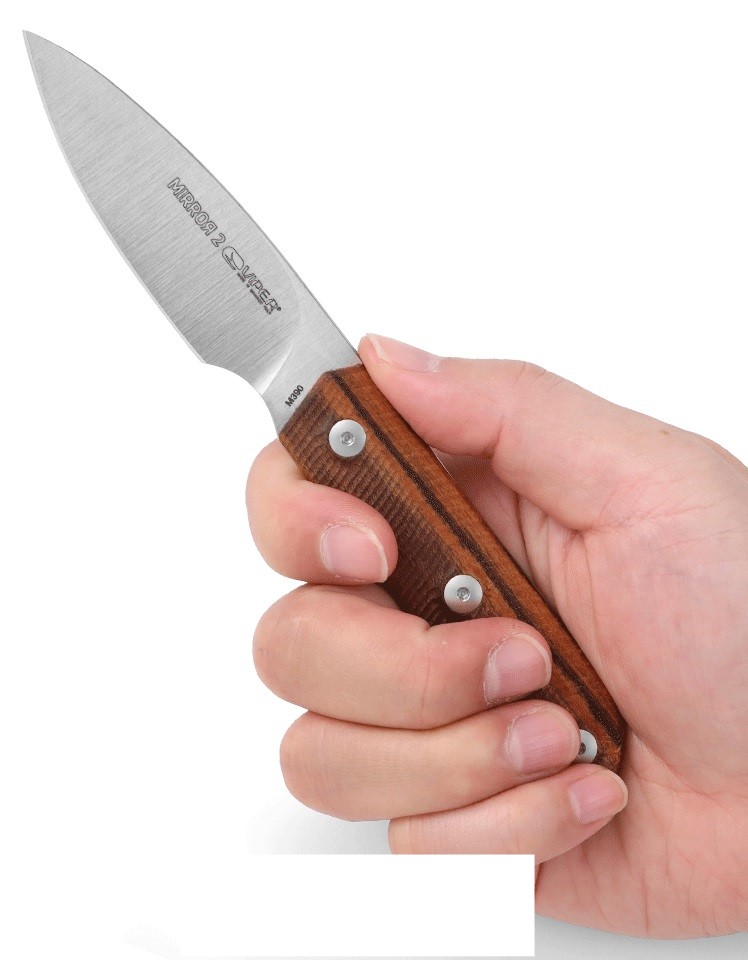 Viper Mirror2 由 Igor Bortolussi 設計,與 Mirror1 採用獨特的鏡像設計。 Mirror2 擁有寬闊的水滴形刀刃,寬大的刀腹賦予其強大的切割能力和清晰的穿刺點。刀片採用 M390 不銹鋼製成,確保其具有出色的鋒利度保持性和耐腐蝕性。 3D 加工的刀柄貼片提供牢固的握持感,並設有多個舒適的凹槽,方便正握或反握。 Mirror2 配有磁性皮革刀鞘,方便攜帶。