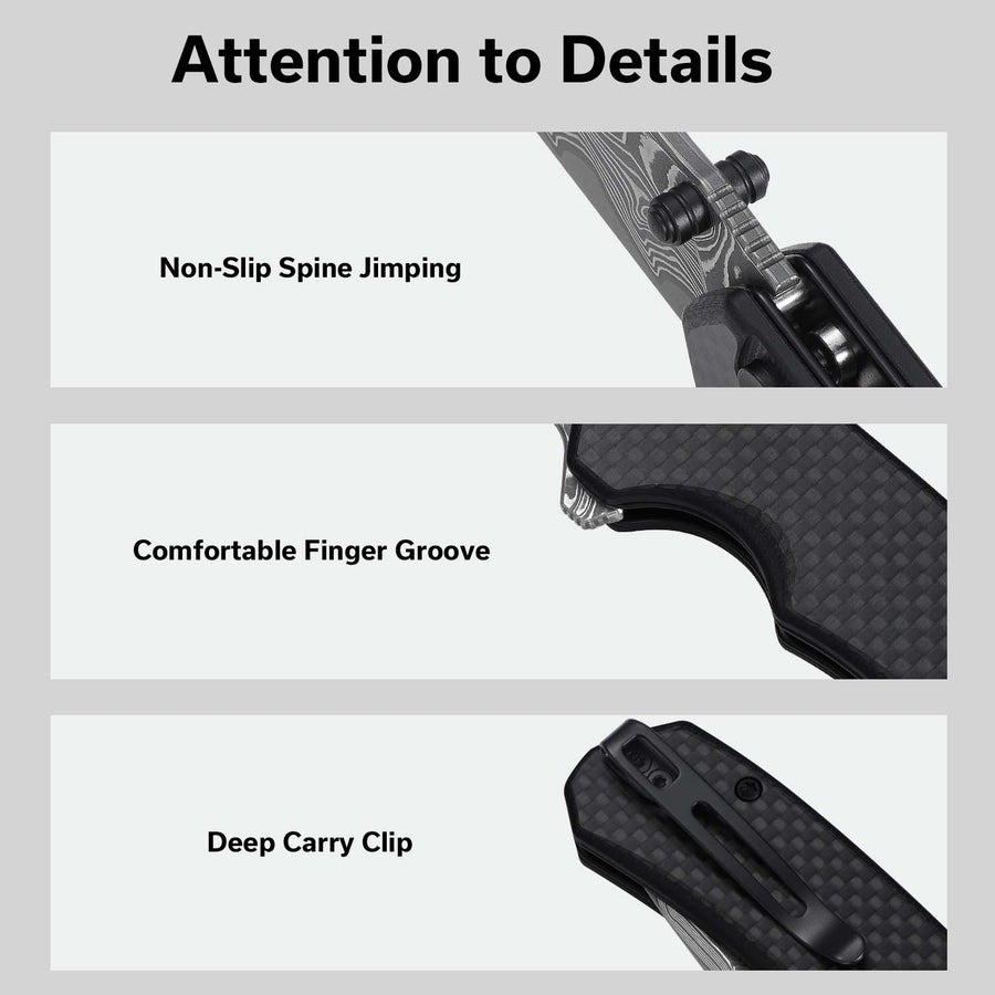 這把 Civivi Brazen 的刀刃採用大馬士革鋼製成。它美觀時尚,而且非常實用。大馬士革鋼的製作過程是將不同類型的鋼材焊接在一起,並在極高的溫度下經過多次折疊鍛造而成。這種鋼材融合了古老的技藝和現代的工藝。由於製造商並未提供關於鋼材類型的詳細信息,因此我們無法確定這種鋼材的耐腐蝕性如何。所以,建議保持刀刃清潔,並定期塗抹幾滴油。這項建議也適用於您其他的刀具。
