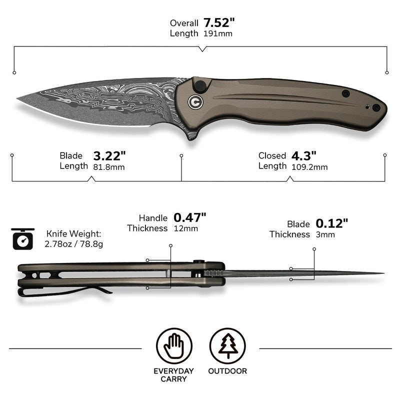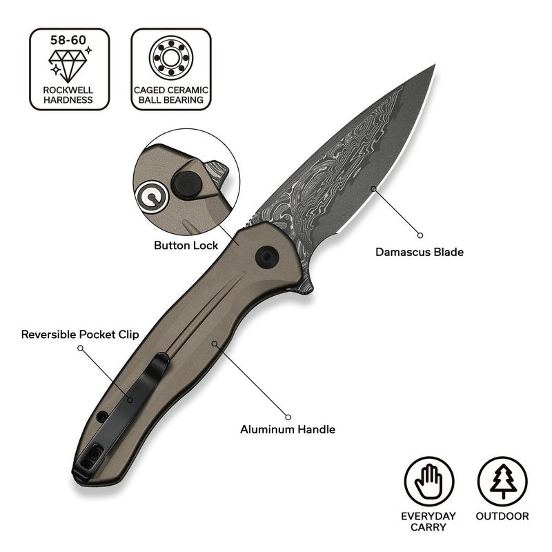 We Knife/Civivi Kitefin棕鋁柄Flipper按鈕鎖折刀/Damascus鋼