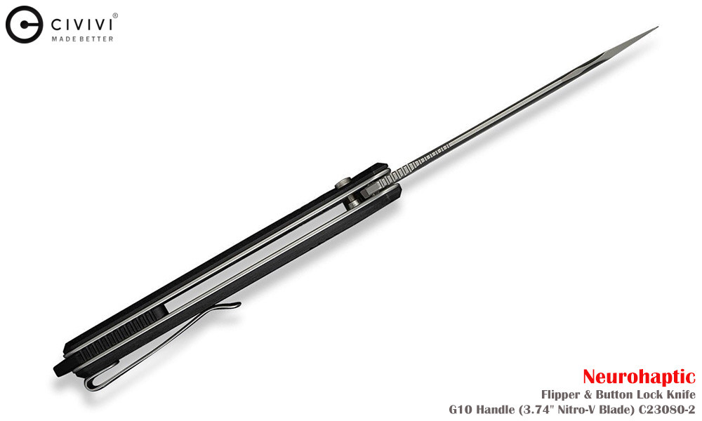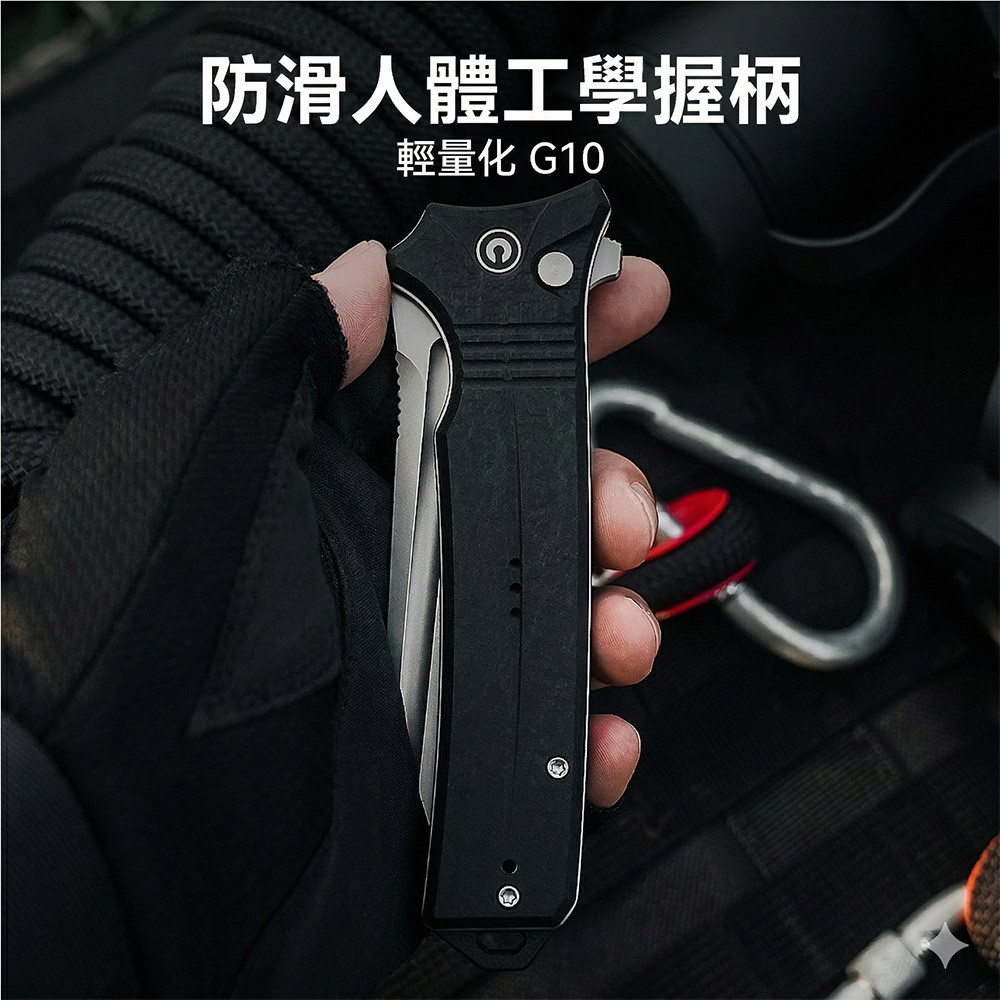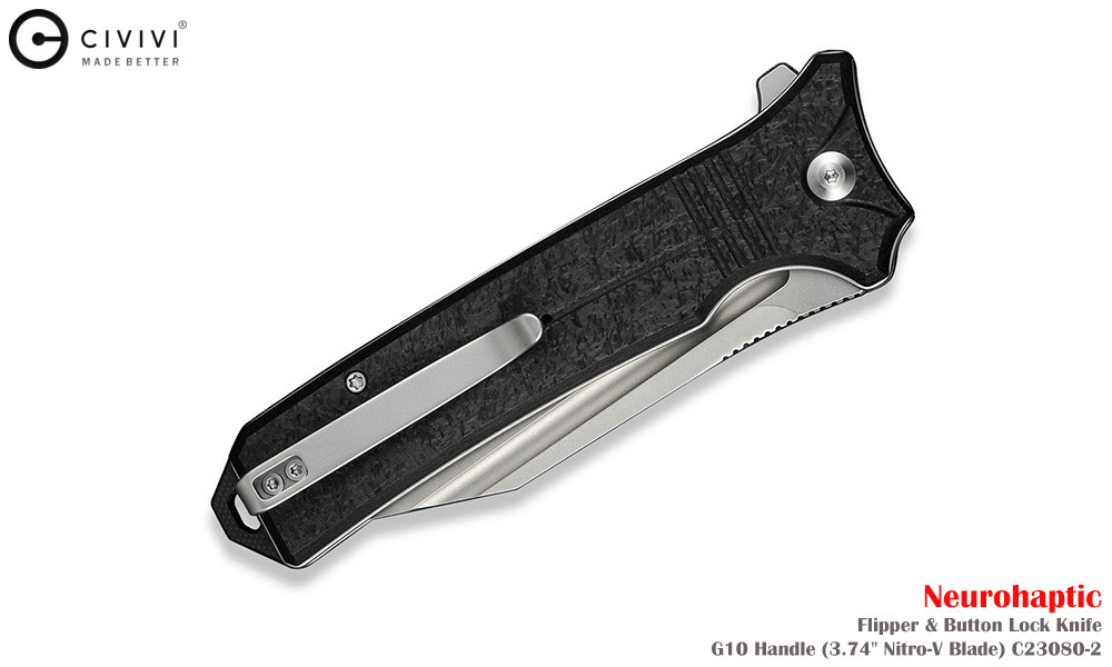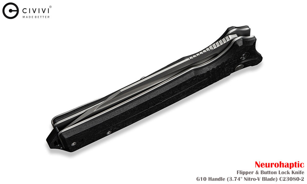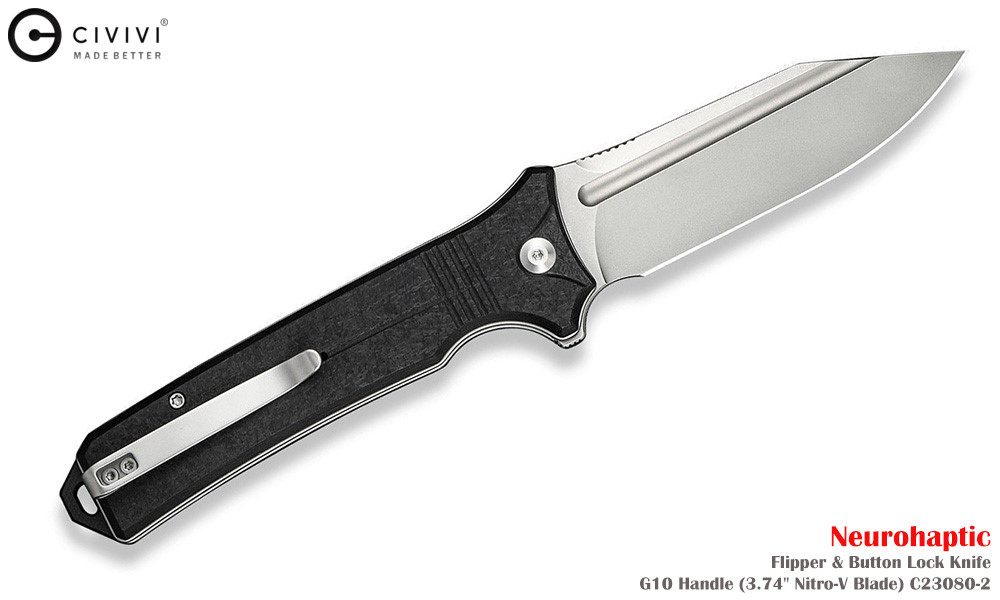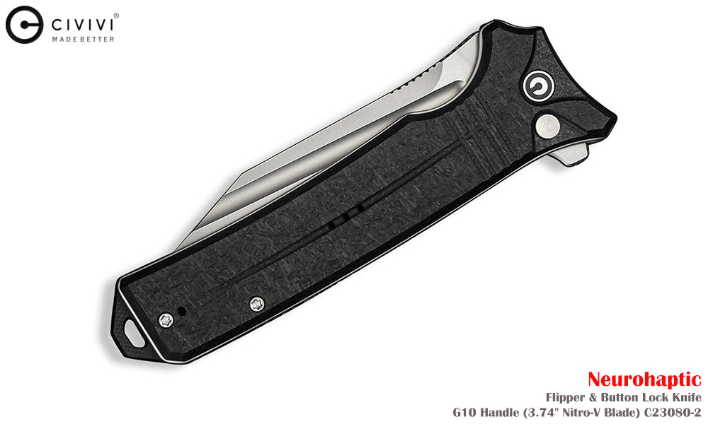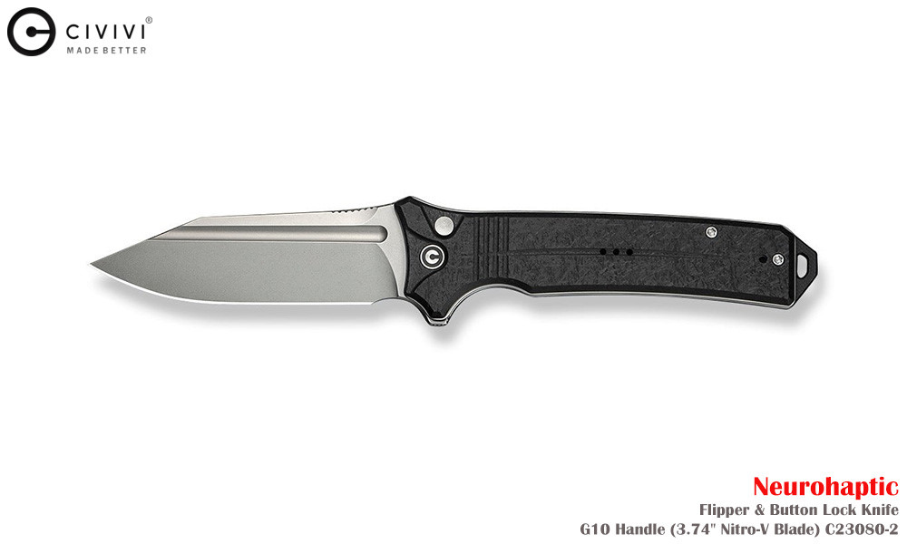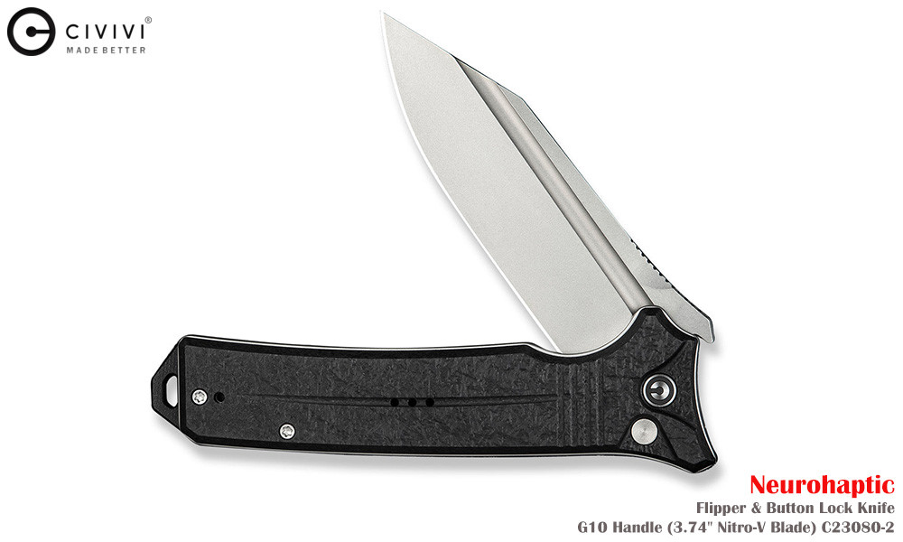 Civivi Neurohaptic C23080-2 石洗 Nitro-V 鋼材,黑色碎 G10 手柄,是一款由 Civivi 出品的堅固耐用的戰術折刀。這款刀最突出的特點是其出色的人體工學設計,握感如同手臂的延伸。透過撥片和按鈕鎖定機制,開合操作極為便捷。