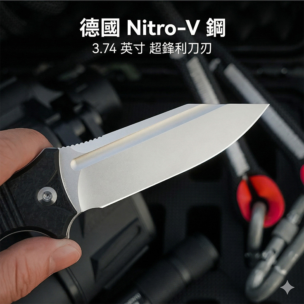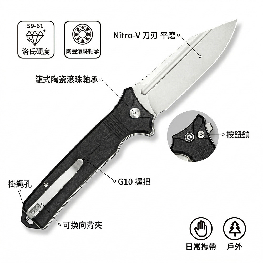 這款 Civivi 的刀刃採用德國 Nitro-V 鋼材製成。這是一種易於打磨的不銹鋼。 Nitro-V 鋼材也非常堅韌,並且能夠很好地保持鋒利度。