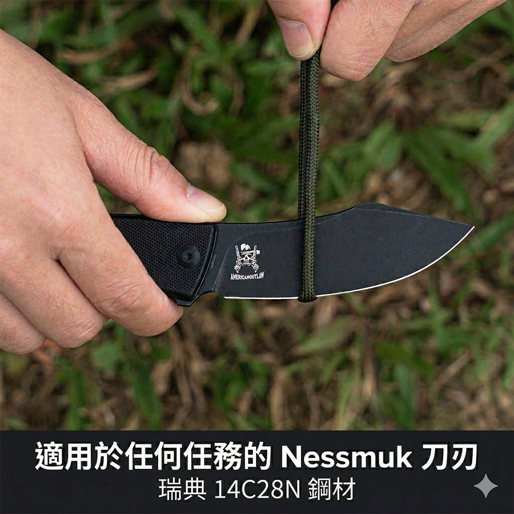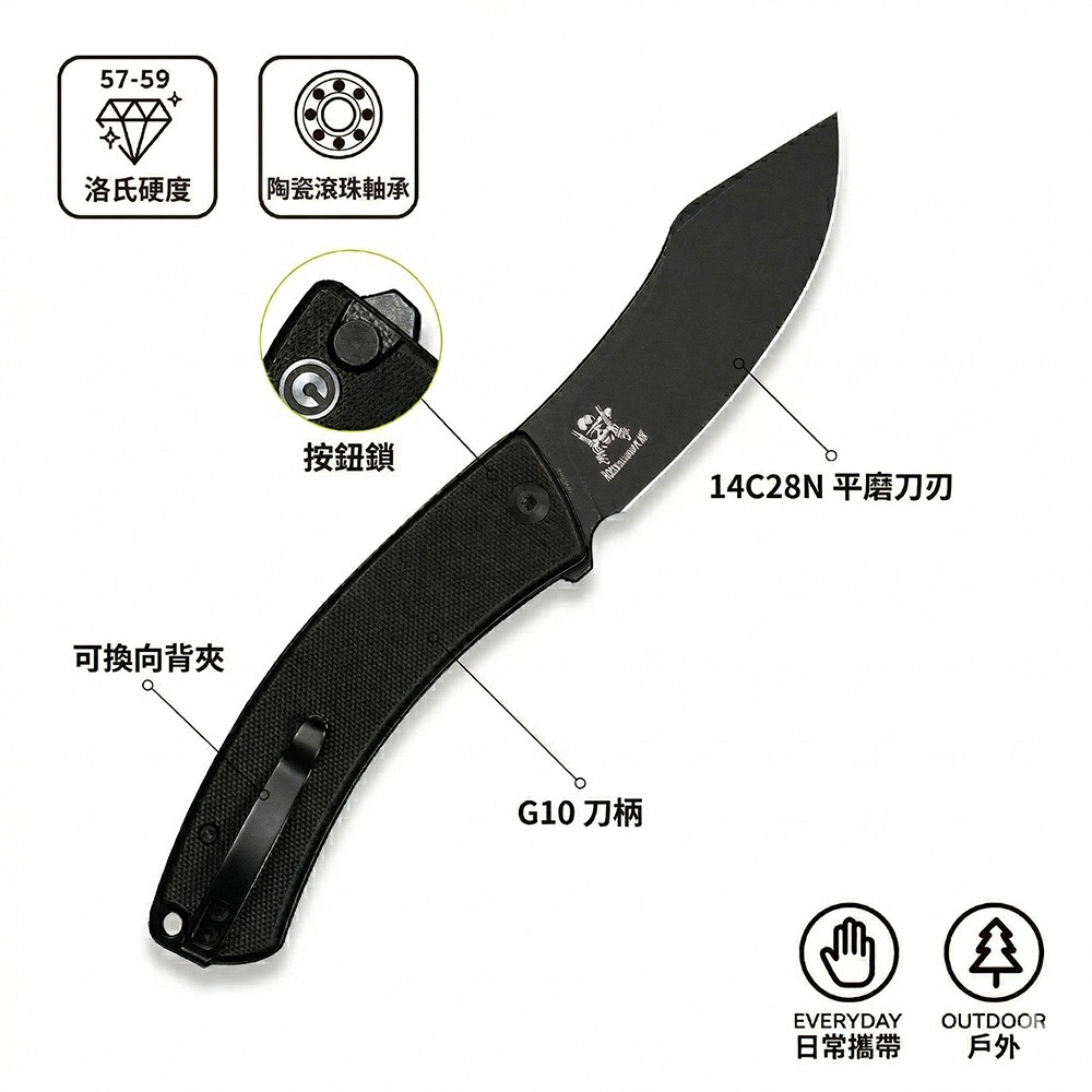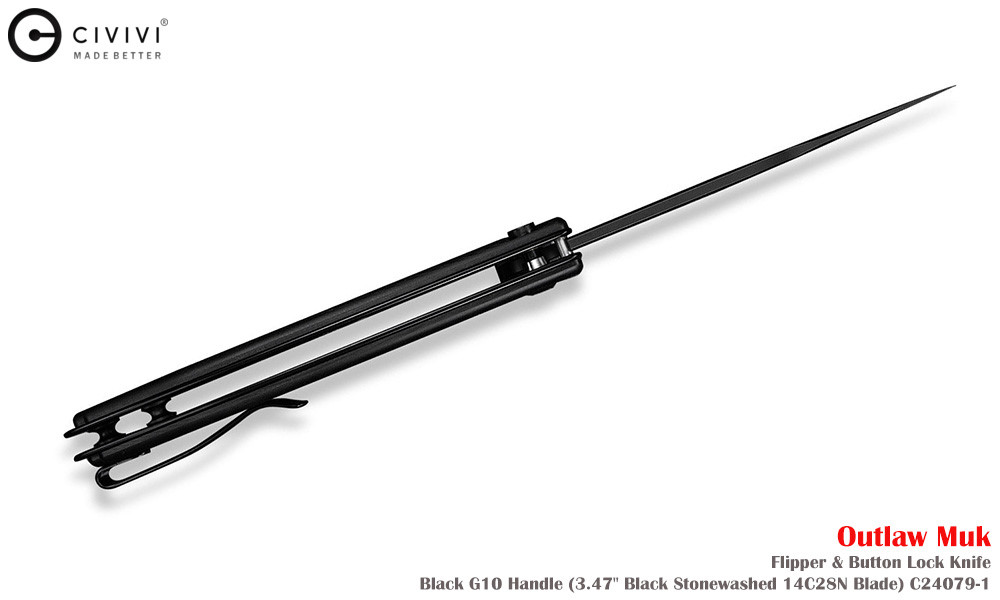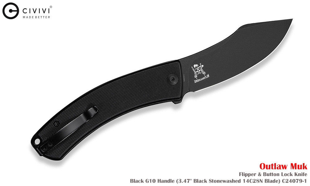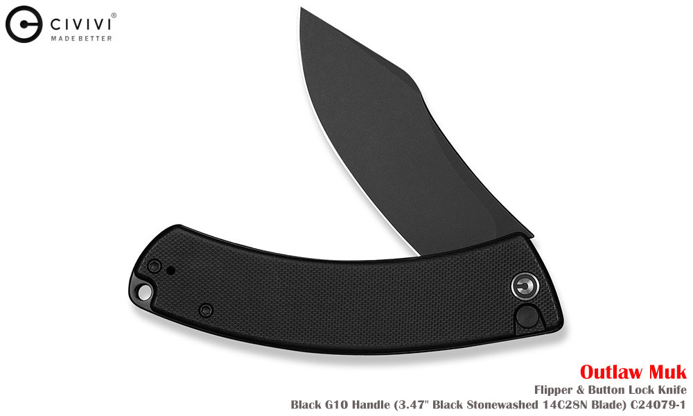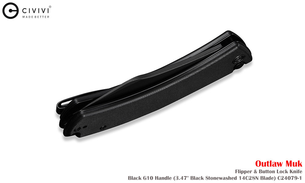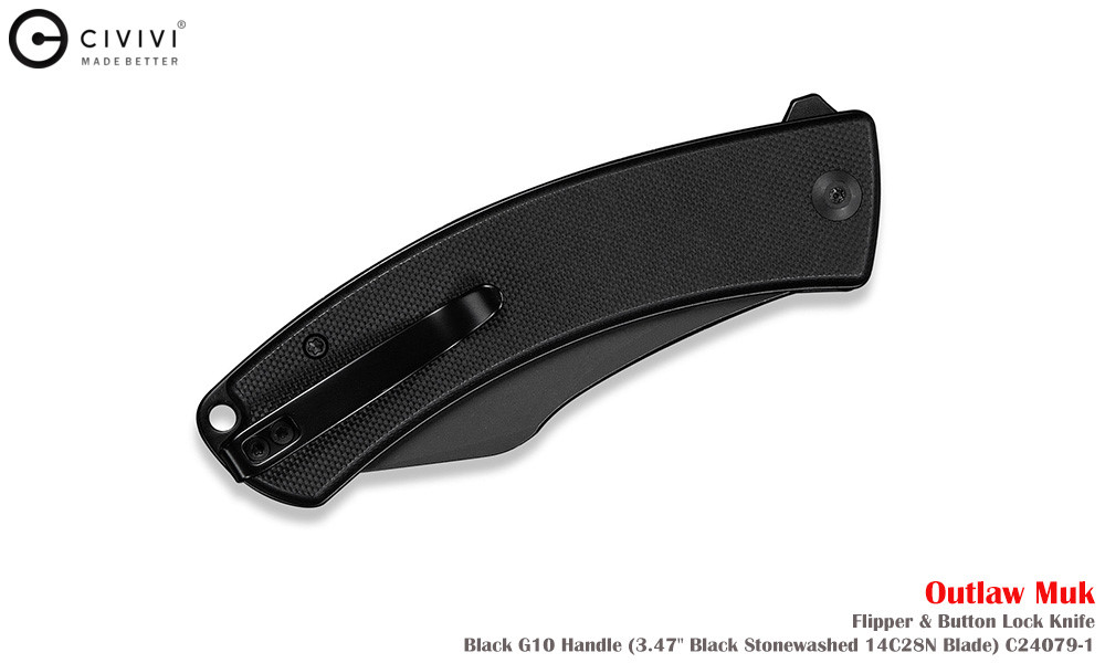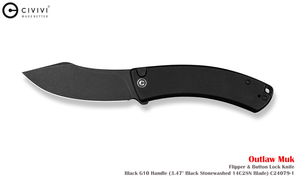Civivi Outlaw Muk C24079-1 Blackwashed 14C28N,黑色 G10手柄,是一款堅固耐用的口袋刀,外觀引人注目。弧形手柄握感極佳,操控性出色,弧形刀刃可輕鬆切割各種材質。獨特的設計不僅外觀酷炫,而且非常實用。無論是露營時的雕刻,或是日常戶外雜務,它都能勝任。