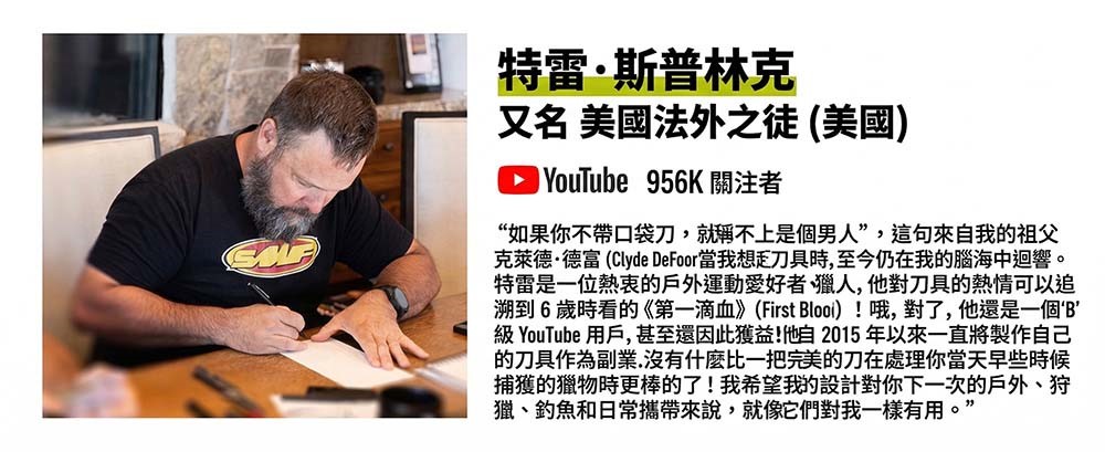 Outlaw Muk 由 Trey Sprinkle 設計,他更為人所知的名字是「最後的美國亡命之徒」(The Last American Outlaw)。他是一位美國刀具設計師兼 YouTuber。他最初是一名園藝師,在那裡他了解到一把好用的工具刀需要哪些特性。他將這些經驗融入自己的設計中:打造出真正耐用且實用的刀具。在他的熱門 YouTube 頻道 American Outlaw 上,他擁有近百萬的粉絲,分享他的創意項目和對戶外運動的熱情。他與 Civivi 等品牌的合作完美地體現了他的設計理念:功能實用、個性鮮明且獨具匠心的刀具。