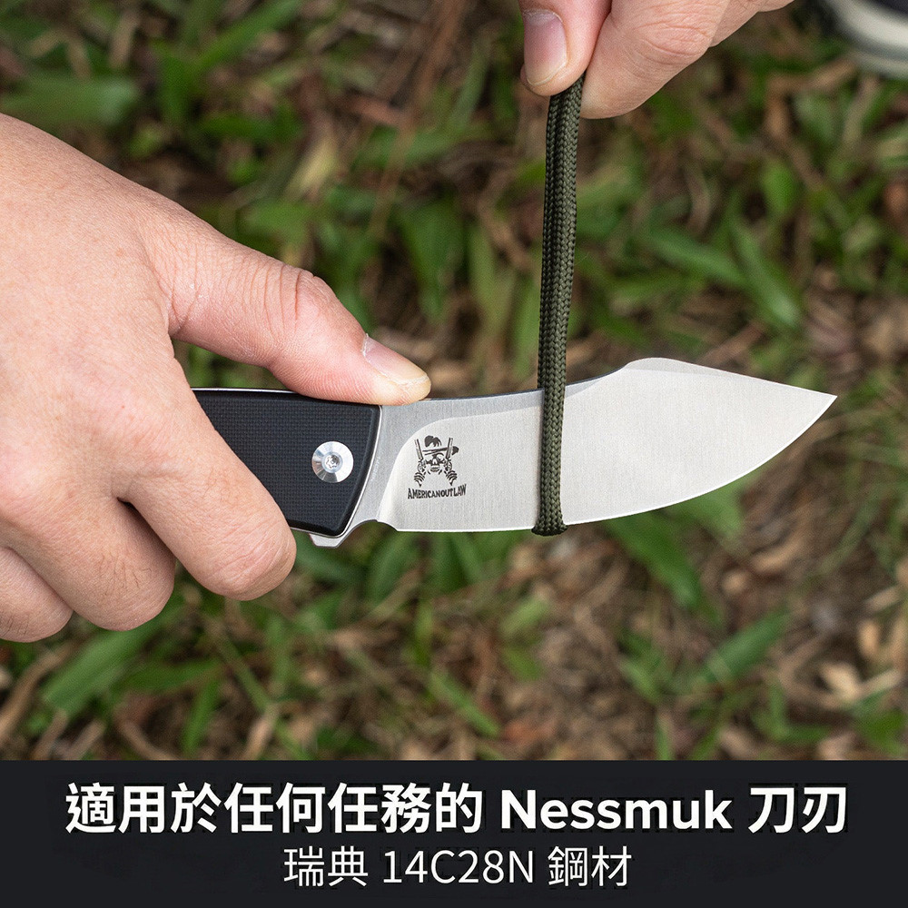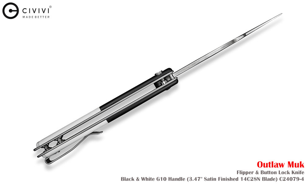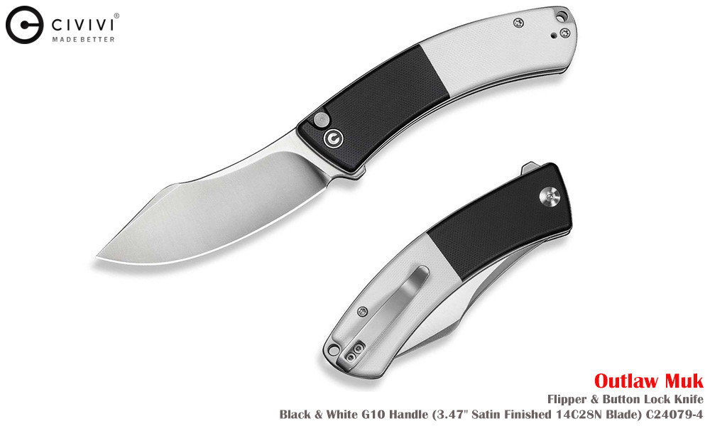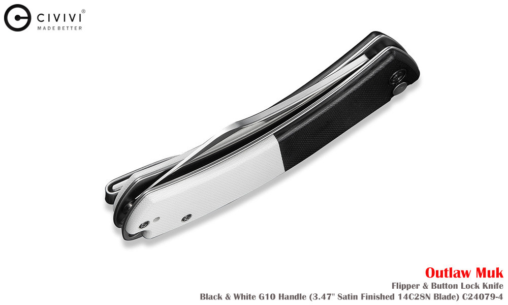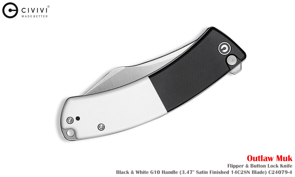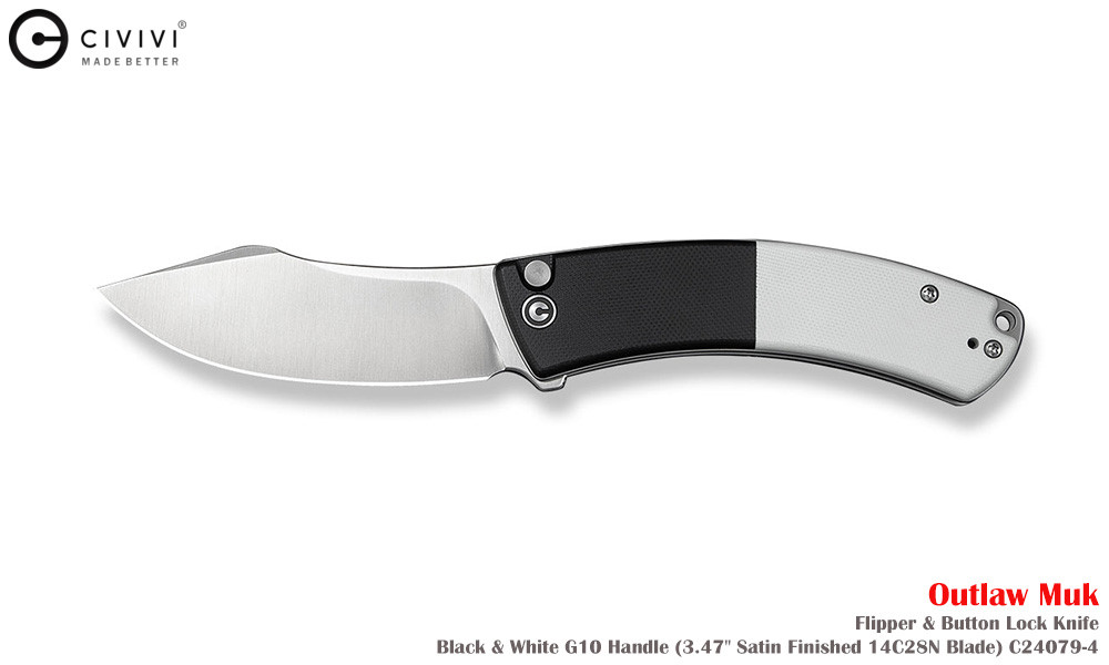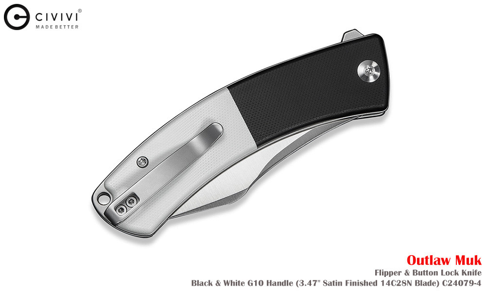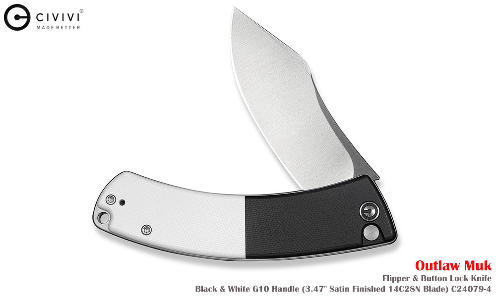 Civivi Outlaw Muk C24079-4 Satin 14C28N,黑白色 G10手柄,是一款堅固耐用的口袋刀,外觀引人注目。弧形手柄握感極佳,操控性出色,弧形刀刃可輕鬆切割各種材質。獨特的設計不僅外觀酷炫,而且非常實用。無論是露營時的雕刻,或是日常戶外雜務,它都能勝任。