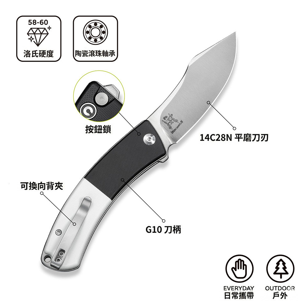 We Knife/Civivi Outlaw Muk 黑/白色G10柄 Button Lock 折刀 -14C28N鋼(Satin處理)