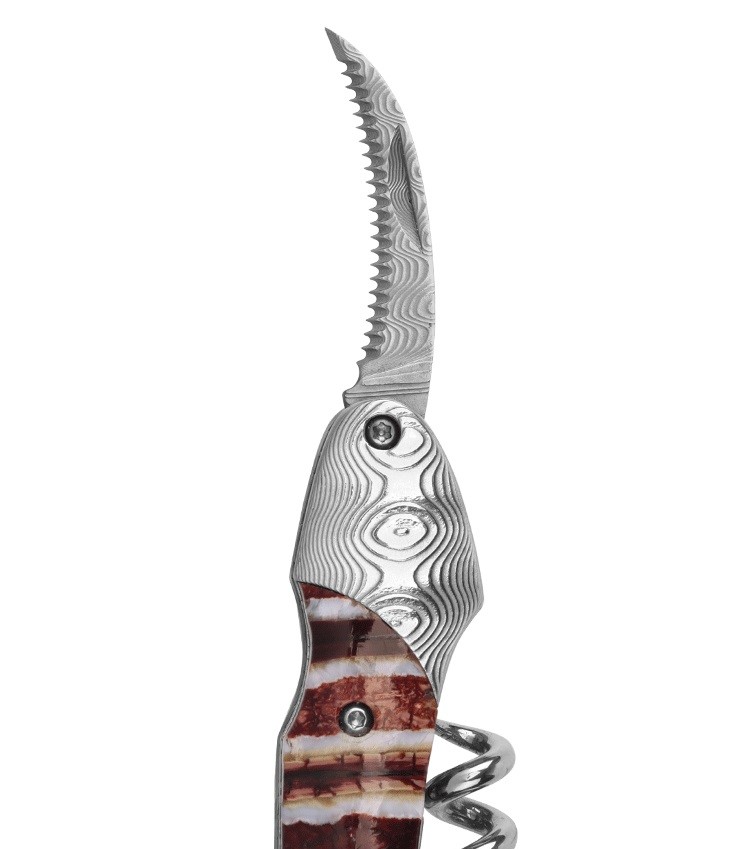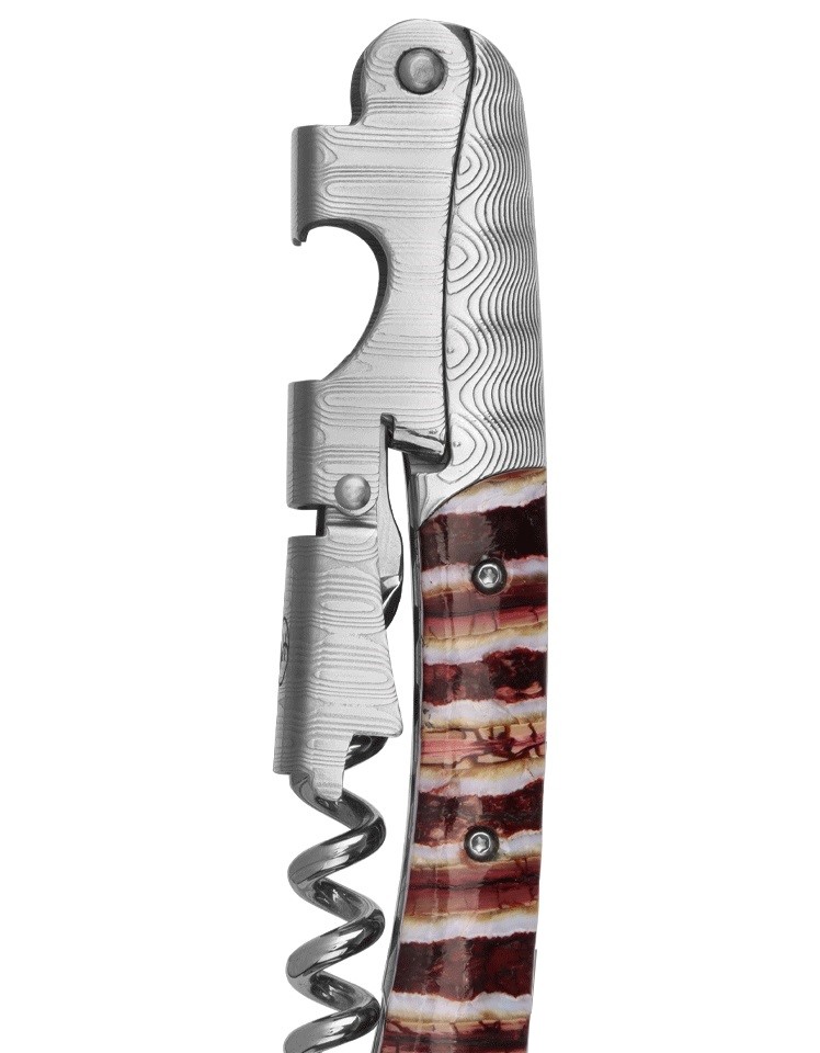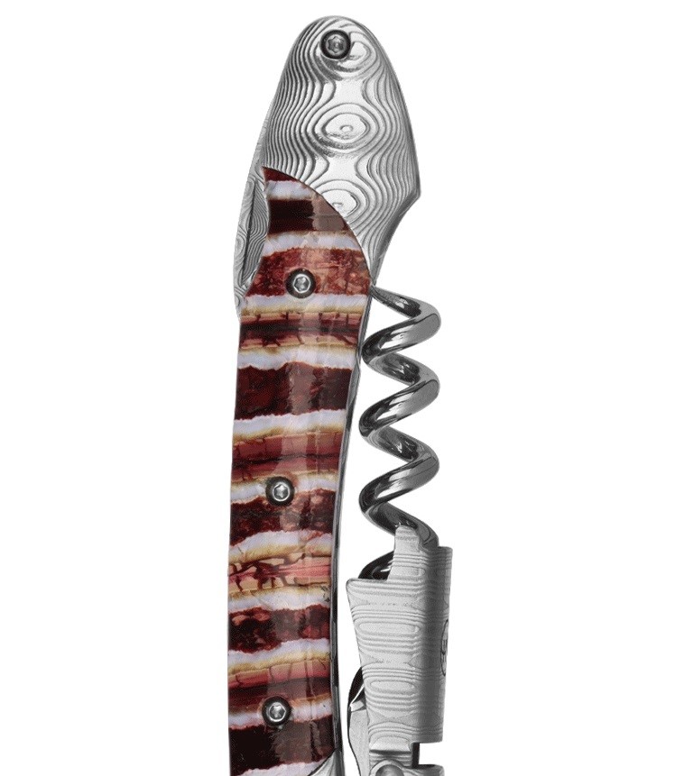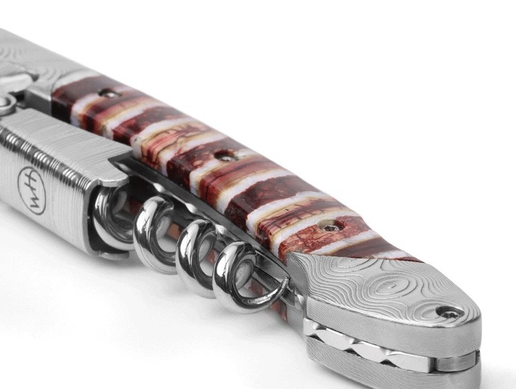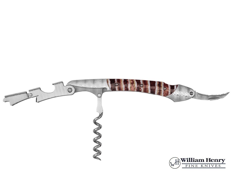 威廉·亨利「雙耳瓶」是一款雙鉸鏈侍酒師開瓶器,配有大馬士革鋼框架、槓桿和錫箔切割器。這款精美的開瓶器還鑲嵌著令人驚嘆的猛獁象臼齒化石,並在整個瓶身進行了銼磨,展現了我們一貫注重細節的概念。
