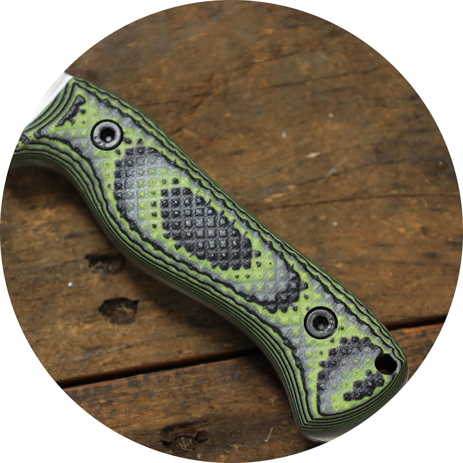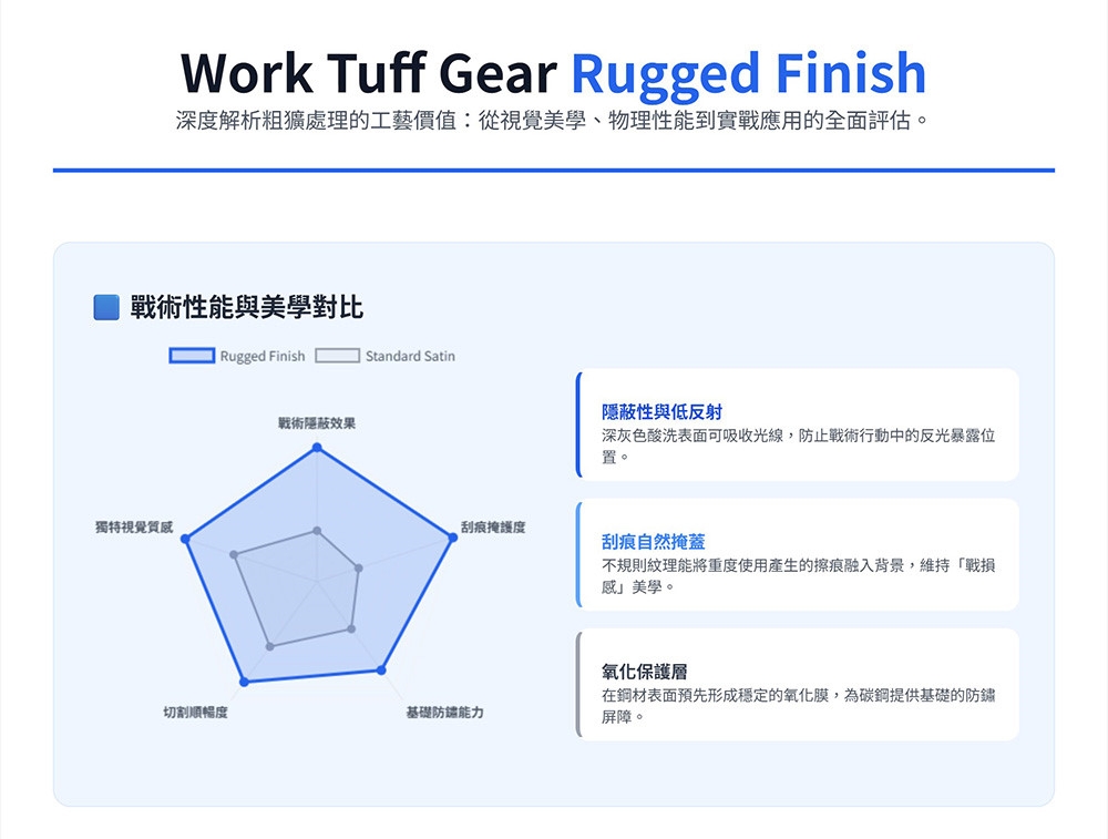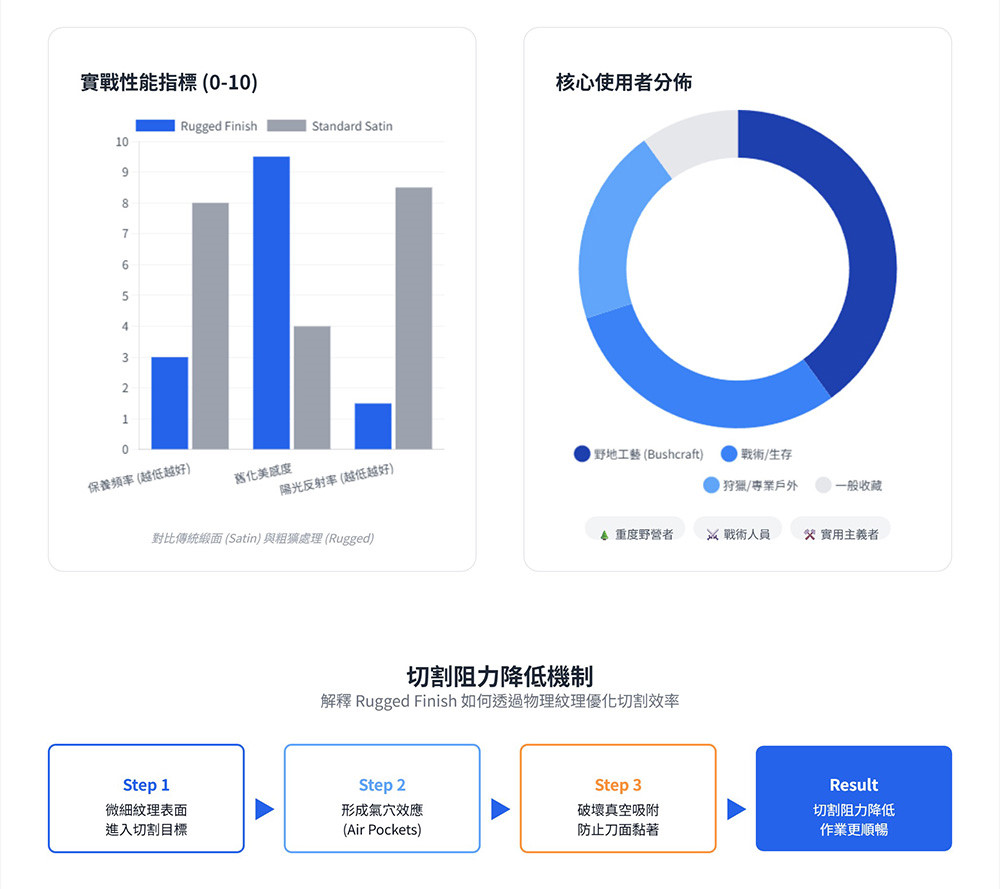 ●Scalloped G10 Handle: 握柄表面通常有深溝槽或「Gator Grip」紋路,提供極強的摩擦力,即便手部潮濕或戴手套也能穩定掌控。