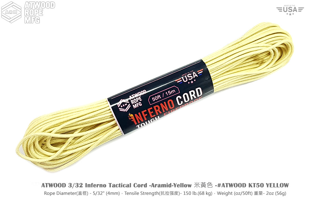 ATWOOD 3/32 Inferno Tactical Cord 耐熱 / 高抗拉傘繩 - 黃色 / 50呎 / 2.4mm / 芳綸外編織