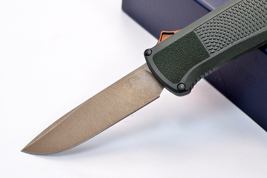 超輕量!這款 Benchmade Mini Bugout AXIS 折刀採用Drop-Point刀刃,刀片材質為 Elmax 不鏽鋼(硬度 59-61HRC),Cerakote處理,並配有棕色氧化鋁拇指柱。。刀柄採用紋理豐富的 Taiga Green Grivory材質,配有燒銅色墊片、掛繩孔、黑色 Axis 鎖定裝置和可翻轉的刀尖朝上的口袋夾。