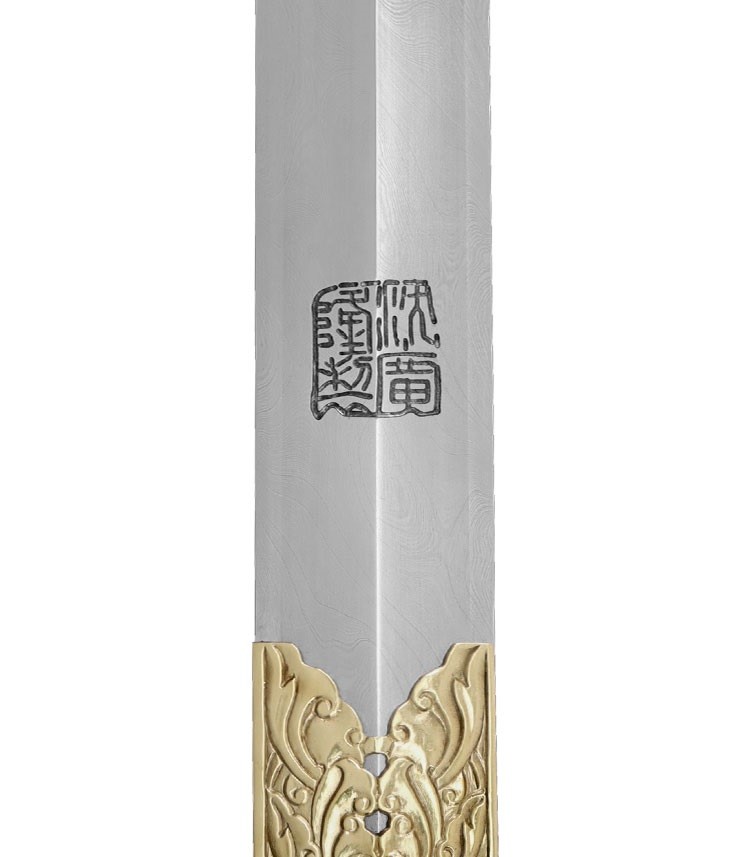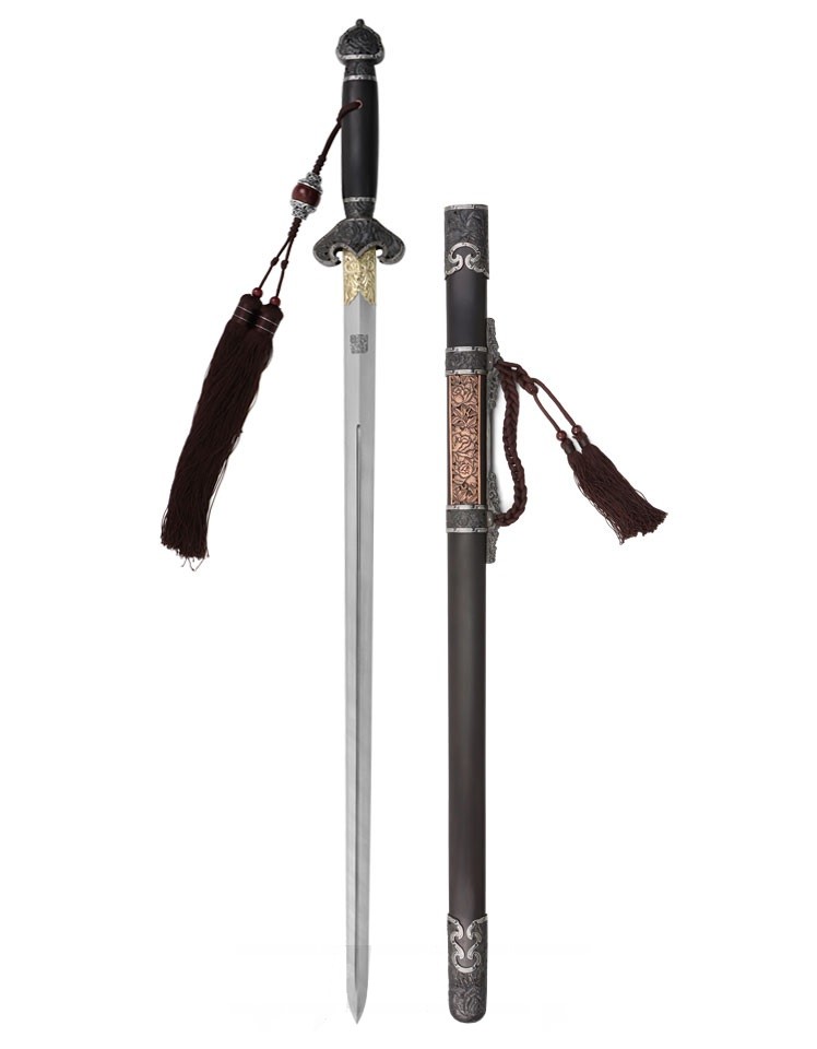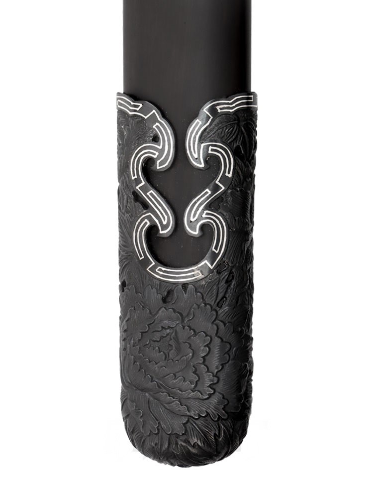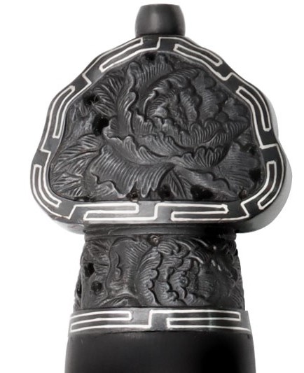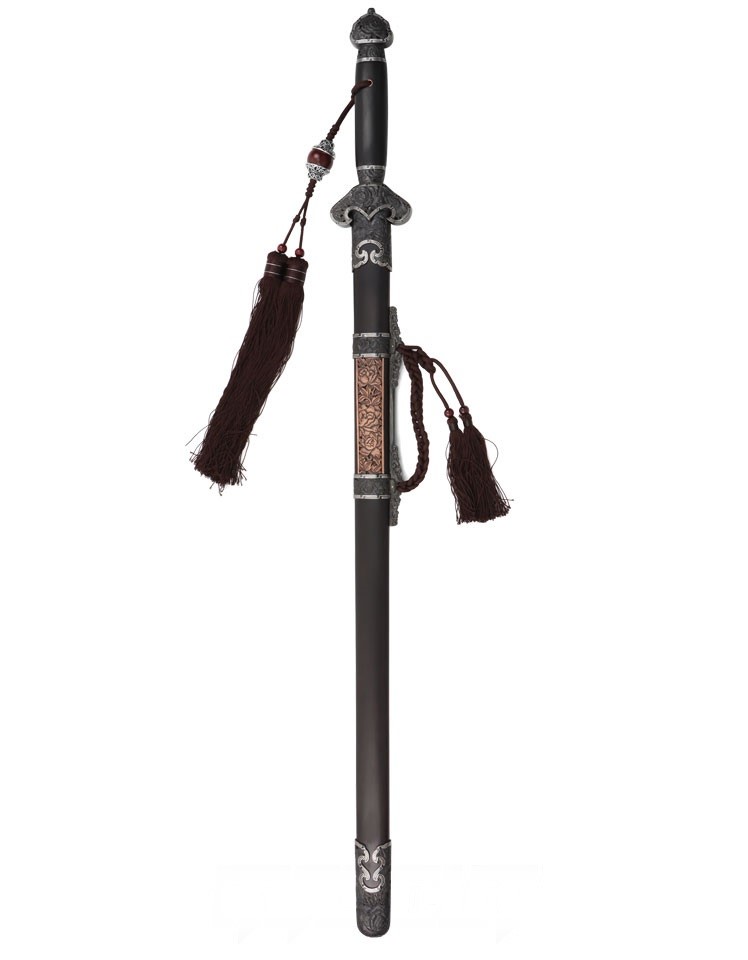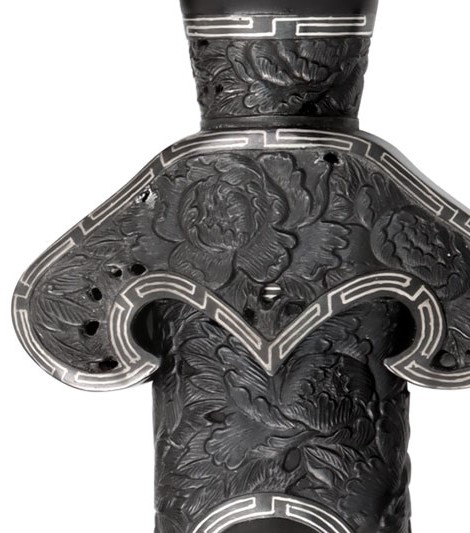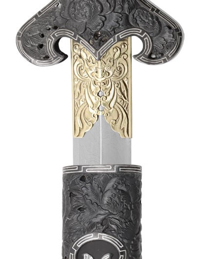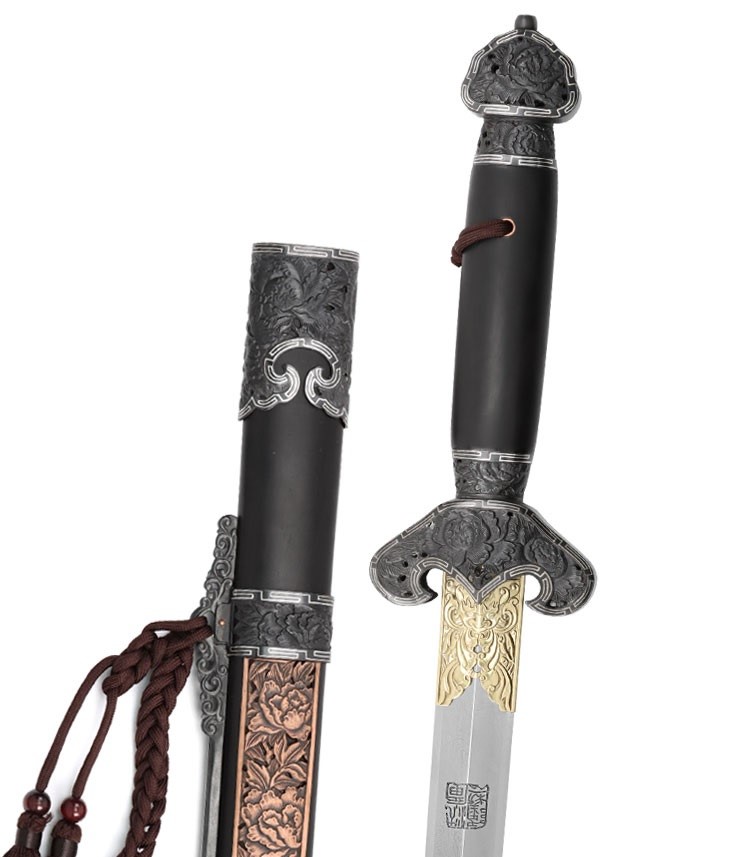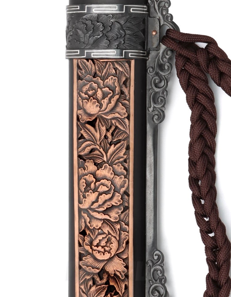 相對刀而言,清劍的戰場兵器功能幾乎不再。清朝雖然仍製造少量寶劍,但多作為賞玩用品或皇室賞賜王室人員和文武大臣之用。此款清劍即是以觀賞為訴求,各部位裝具雕刻牡丹花紋飾,牡丹花自古以來即享有「花中之王」美譽,牡丹花外型、花色豐富而多變化,具雍容華貴之氣息,因此牡丹花亦是富貴的象徵。