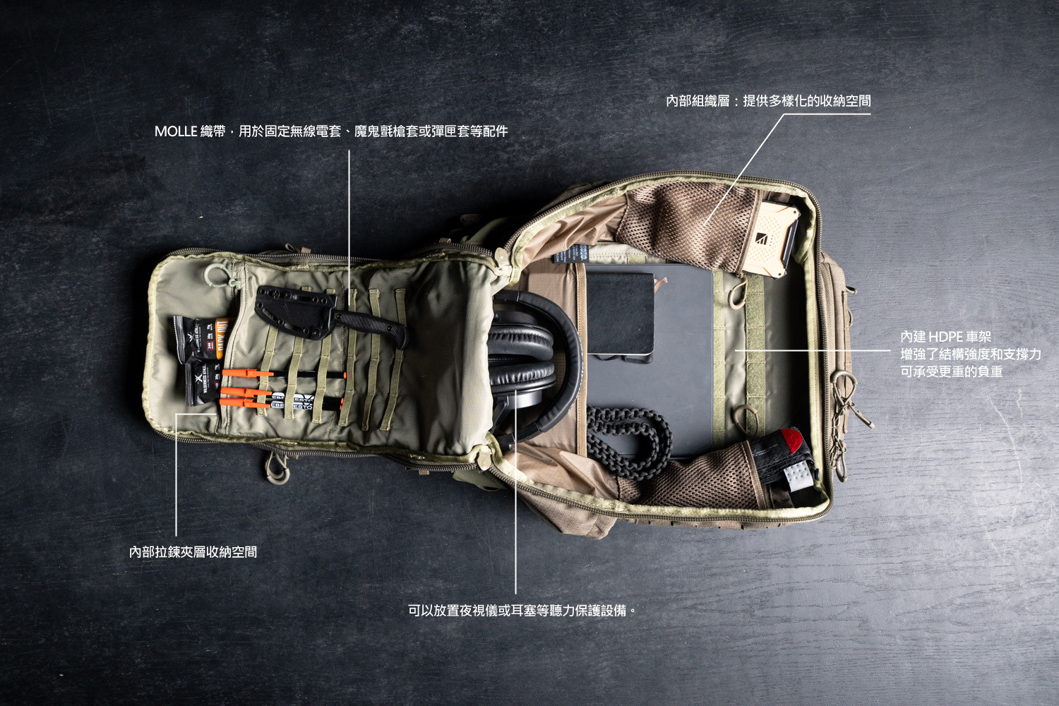 ROMAD 是一款輕巧、緊湊且用途廣泛的通訊突擊背包,經過實戰測試和不斷改進。與 FAC Track 等傳統無線電背包相比,ROMAD 體積更小,其流線型設計降低了您的隱蔽性,同時又提供了足夠的空間存放補給品和額外裝備。這些設計選擇使得 ROMAD 能夠勝任各種場合,無論是野外行進、靶場訓練或作為緊急背包。 ROMAD 的尺寸經過精心設計,可適配 PRC117 等通訊系統,內部設有環形 MOLLE 織帶,用於固定無線電套、魔鬼氈槍套或彈匣套等配件。通訊埠處的鎖定拉鍊可在野外提供安全保障,並作為抵禦惡劣環境的第一道防線。 得益於貫穿背包頂部至底部的U型全長開口,取放內部物品快速方便。這種設計讓您無需在背包內摸索,即可快速找到所需裝備。獨立的專用水袋隔層可防止液體接觸到背包主隔層內的精密設備、衣物或其他物品。 背包外部有兩個帶拉鍊的收納口袋。上面的口袋非常適合存放隨身必需品,下面的口袋帶有襯墊,可以放置夜視儀或耳塞等聽力保護設備。 ROMAD 的內建 HDPE 車架增強了結構強度和支撐力,可承受更重的負重;符合人體工學的透氣網眼襯墊,無論是否搭配防彈背心,都能提供全天候的舒適性和透氣性。肩帶上的 MOLLE 織帶可牢固地固定和保護線纜,減少纏繞,並方便您整理水袋軟管。 在車輛、直升機和船隻等狹小空間作業時,ROMAD 的纖薄外型使其操控靈活。這使得 ROMAD 成為隨身攜帶或從野外作業到健身房等各種場合的理想選擇。 ROMAD 所有外部表面均覆蓋大面積 MOLLE 織帶,可透過添加相容 MOLLE 的配件進行擴展,讓您能夠根據任務需求優先考慮後勤保障,並根據需要進行調整。