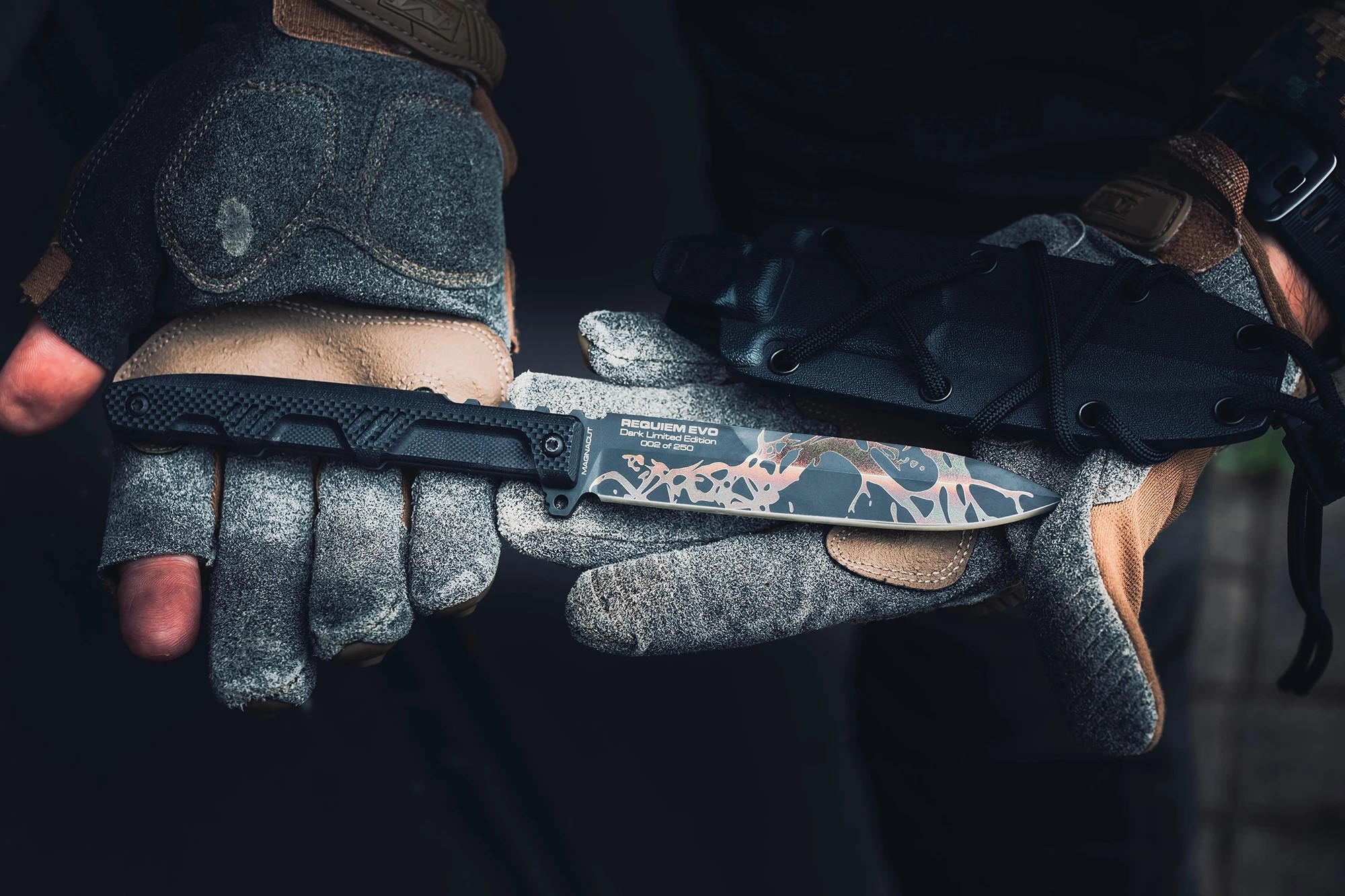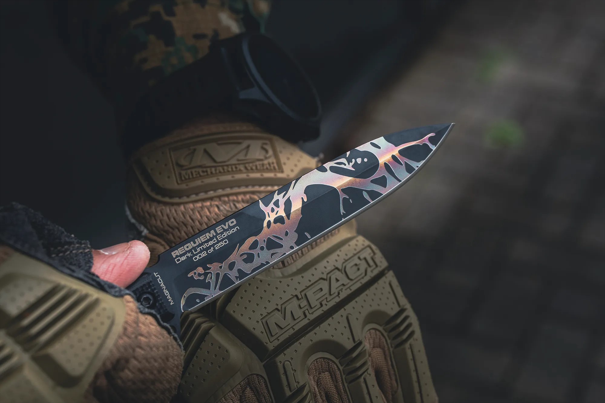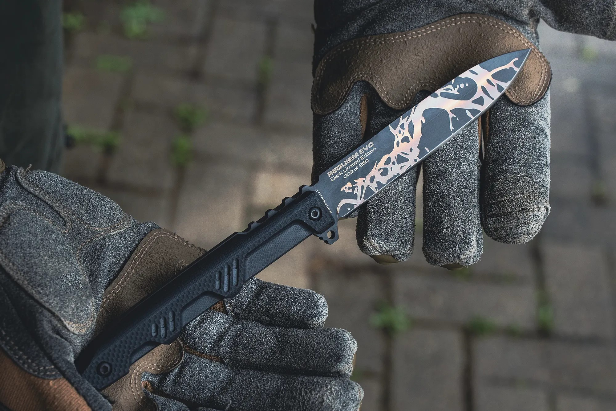 REQUIEM EVO DARK是廣受讚譽的 Requiem 的全龍骨版本,並在各方面都進行了全面升級:更堅固的結構、全新的矛形刀尖輪廓帶來更強的穿透力和更乾淨利落的切割效果、以及具有未來感設計的黑色 G10 手柄。刀身