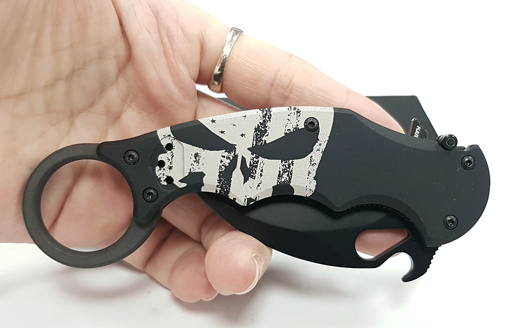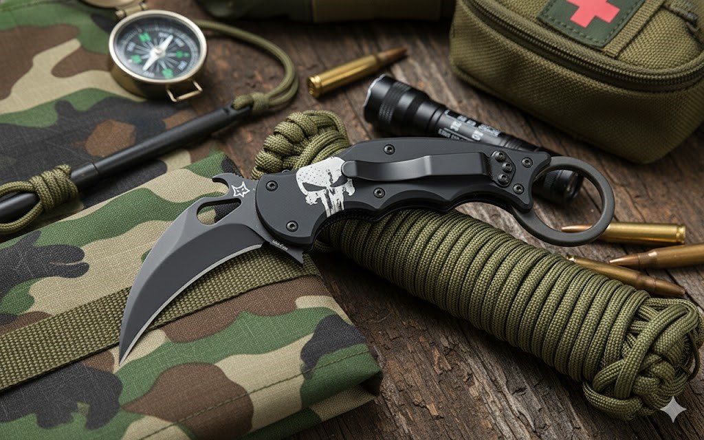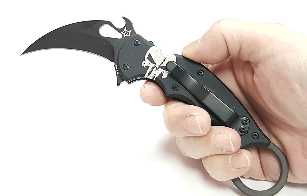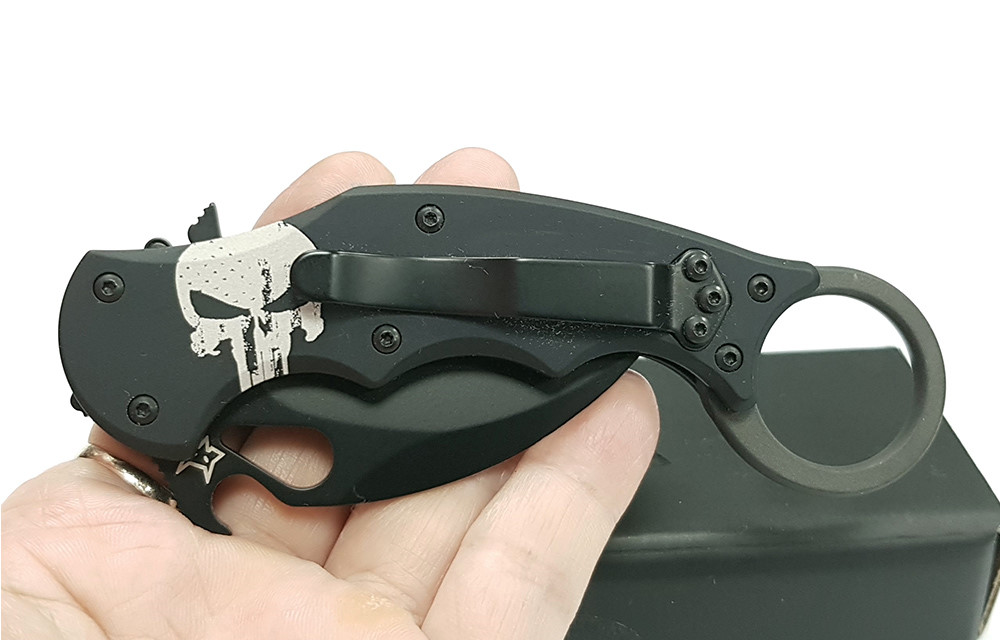 Karambit 被認為是三合一工具:實用刀、武術刀和防衛刀。手柄背面有一個夾子。