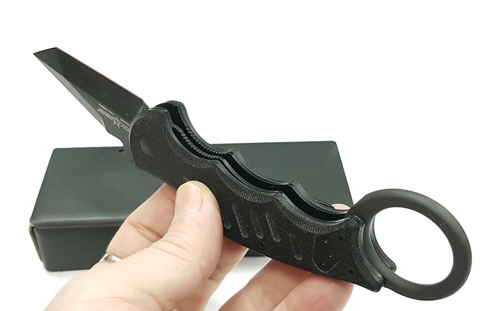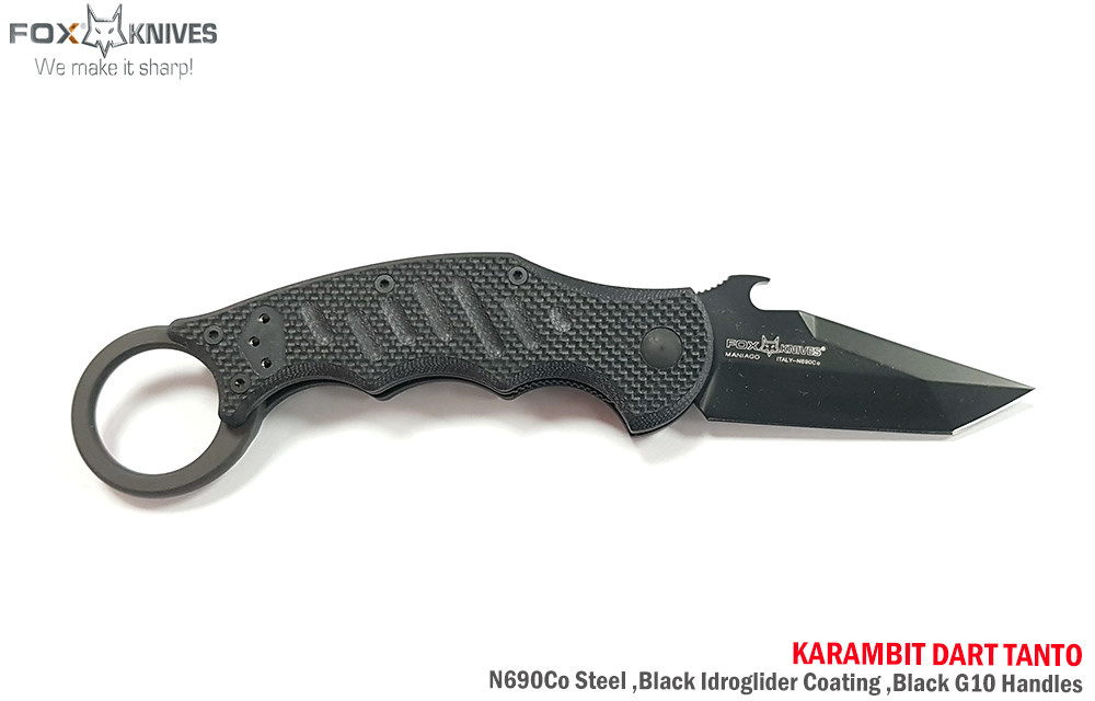 FX-597 Karambit從FOX刀是由DOUG MARCAIDA設計。特點是N690Co不銹鋼Teflon塗層黑色塗層刀片和高度質感黑色G10手柄。 雙層不銹鋼內襯增加強度和穩定性。可拆卸不銹鋼口袋夾。FX-597採用Emerson公司的專利功能Emerson Wave Patent n° 5.878.500 背面刀刃快開勾設計能在緊急時快速的使用是軍事,救援和執法用戶的喜愛。