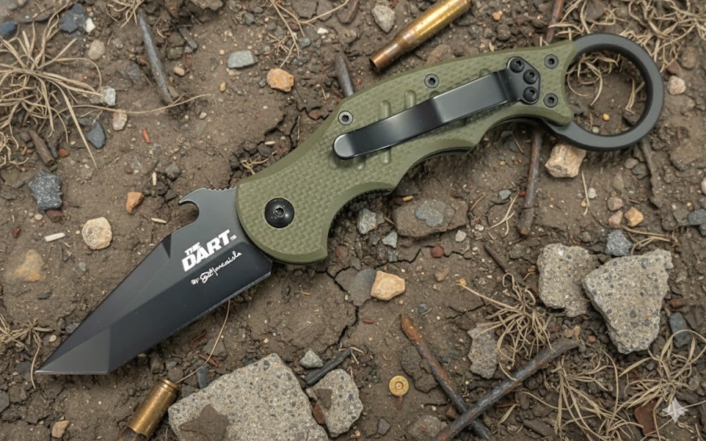 Fox Knives 的 FX-597(通常被稱為 The Dart)是一款非常獨特的戰術折刀。雖然它具備爪刀(Karambit)的指環特徵,但與 FX-599 最大不同在於其刀刃形狀與設計師背景