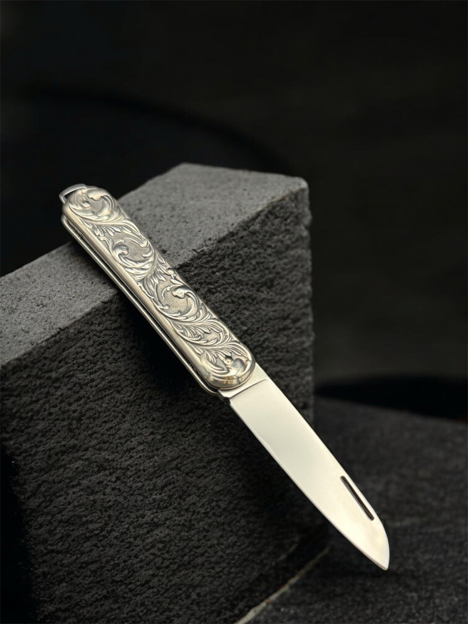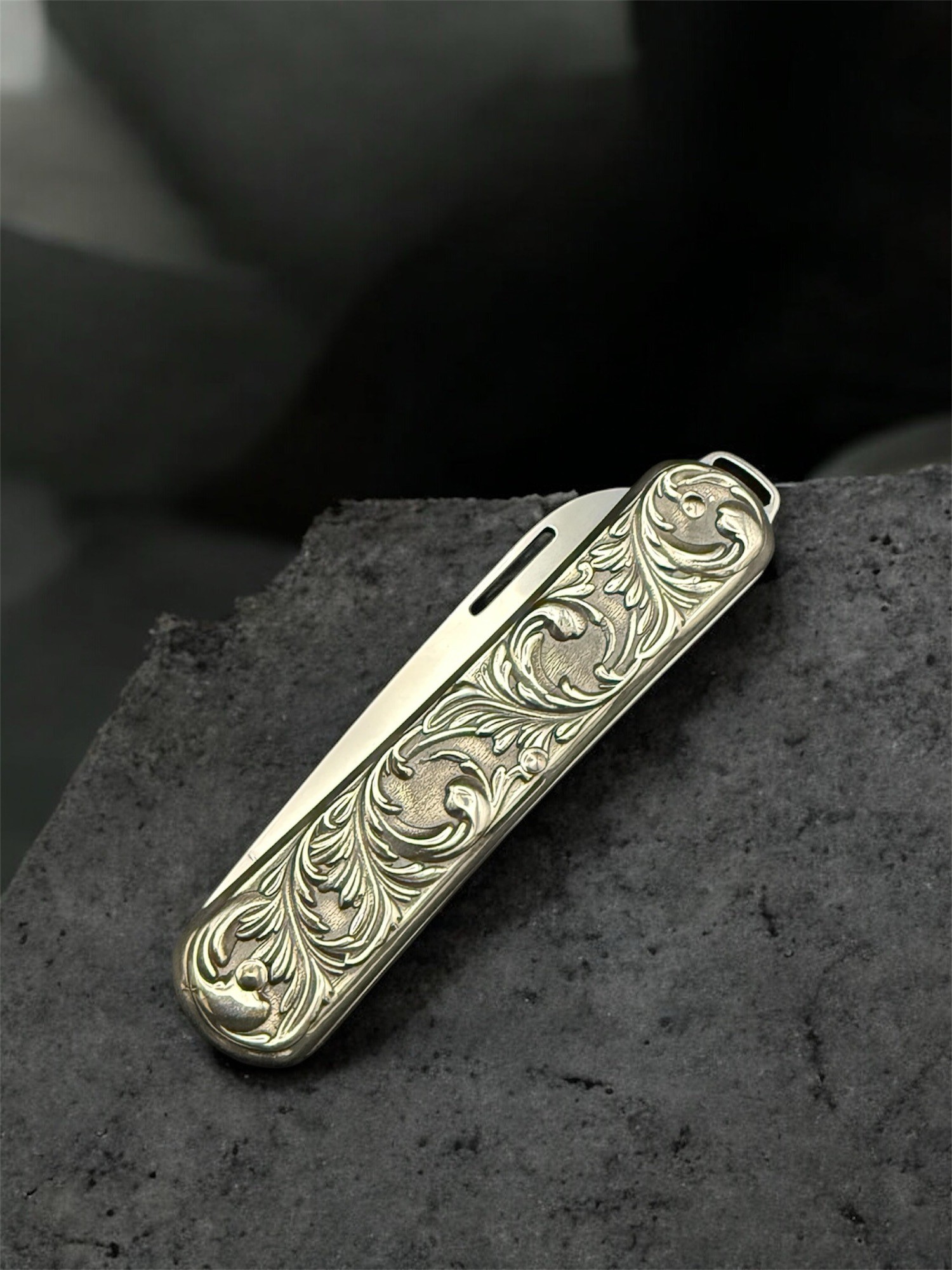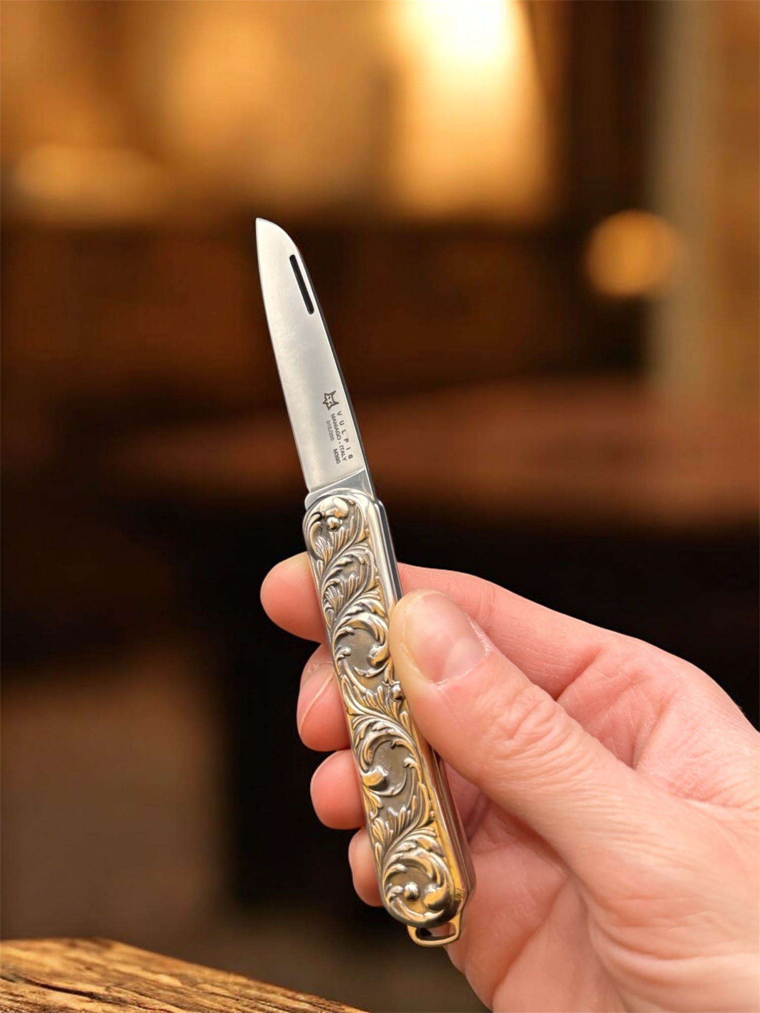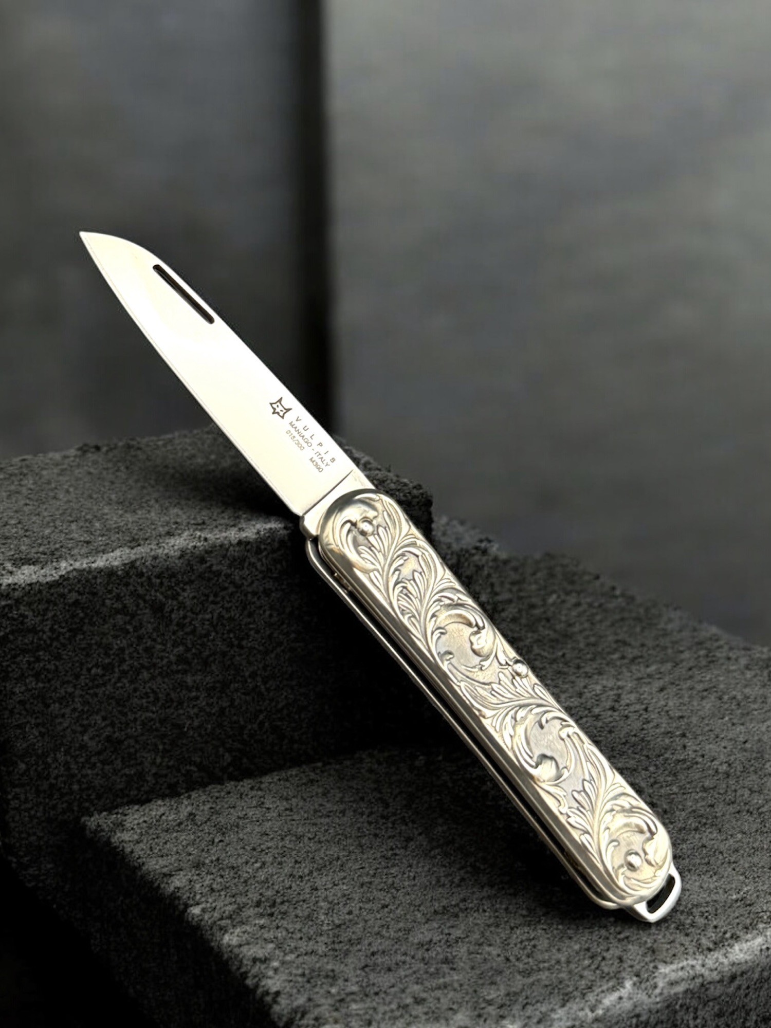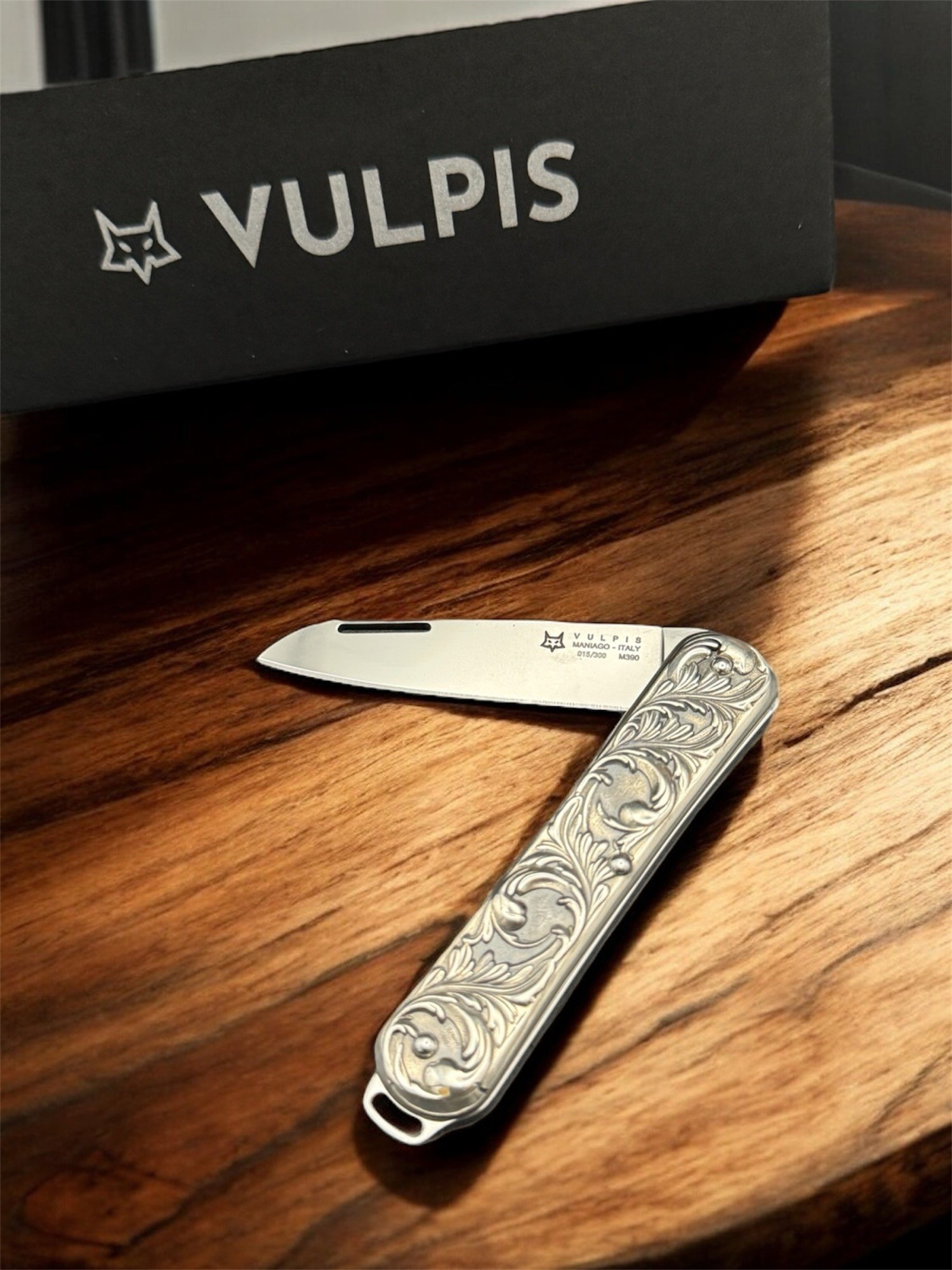 這款限量300把的2025特別版刀具,是對Fox Vulpis經典刀具的致敬之作。其銀色刀柄飾以優雅的阿拉伯式花紋, 8厘米長的刀柄帶來卓越的舒適度和便於攜帶的特性,令人過目難忘。鏤空式折疊刀刃採用M390鋼材打造,刃口光滑,並低調地錒刻著Fox的標誌性狐狸頭圖案。
