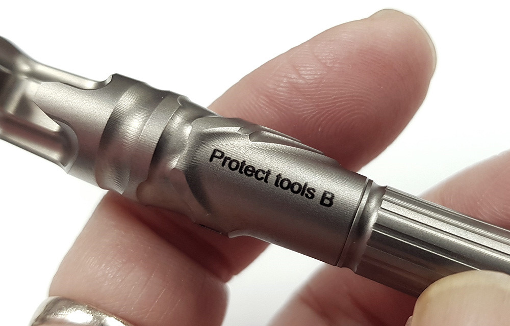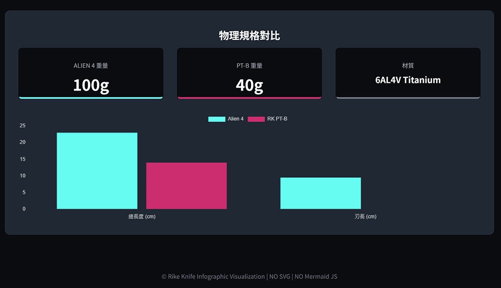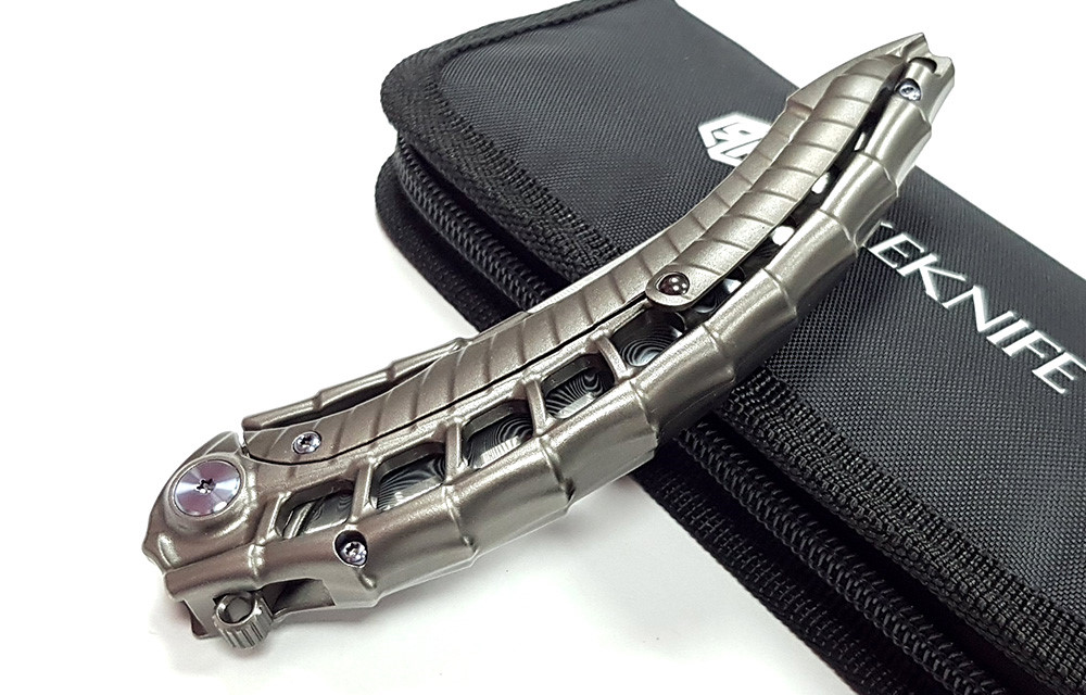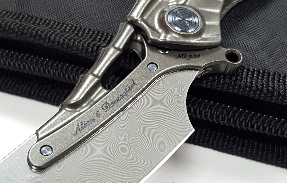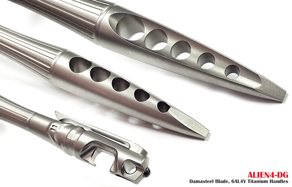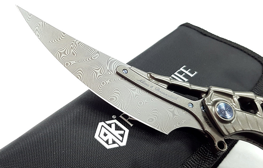 Alien4 深灰色鈦合金折刀,採用大馬士革鋼打造,是一款造型獨特、個性鮮明的折刀。乍一看,它的設計靈感便躍然紙上,酷似H.R. Giger's 為電影《異形》創作的異形圖案。一體成型的鈦合金手柄,堅固耐用,宛如異形的脊椎或胸膛。隨刀附贈保護工具(RK PT-B),這是一款筆形鈦合金多功能工具,配備破窗器、開瓶器、T6/T8螺絲起子和口袋夾。