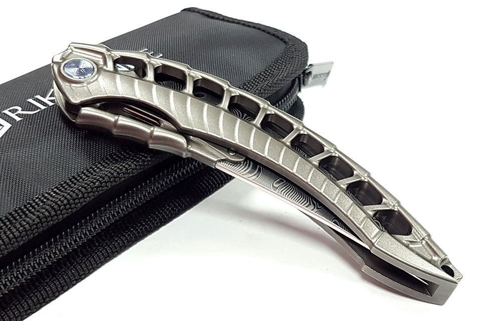 ●手柄採用一體成型設計,由一整塊6AL4V鈦合金經3DCNC工具機銑削而成。這種設計賦予了刀具驚人的強度,但也對生產過程提出了極高的要求。倒角邊緣和食指凹槽消除了鋒利的邊緣,提升了握持的舒適度。手柄背面飾有風格化的圓形圖案,下方銑削的孔洞讓人聯想到異形的骨架。樞軸處飾有風格化的Rike Knife品牌標誌。單位置(右側)深口袋夾可將刀具以刀尖朝上的方式隱密地攜帶在口袋中。