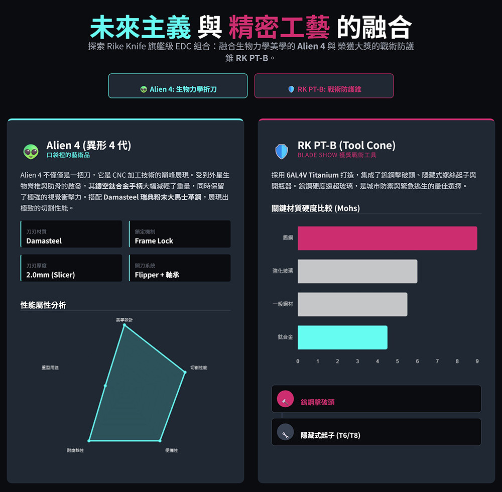 RikeKnife 是一個非傳統品牌,以原創設計為基礎,敢於成為創新者,挑戰當代刀具公司使用的傳統解決方案。它只使用最優質的材料為世界各地的客戶生產品質卓越的刀具。該品牌憑藉高品質的工藝和創新的設計方法,在刀具界享有盛譽。這一點得到了美國傳奇品牌 Microtech 等公司的認可,該品牌歷史上首次委託中國公司 Rikeknife 在美國境外生產其設計的產品。其中包括 SOCOM Bravo 和 Anax 資料夾以及 Kyroh Pen 戰術筆。