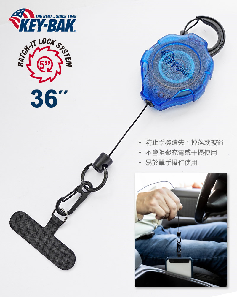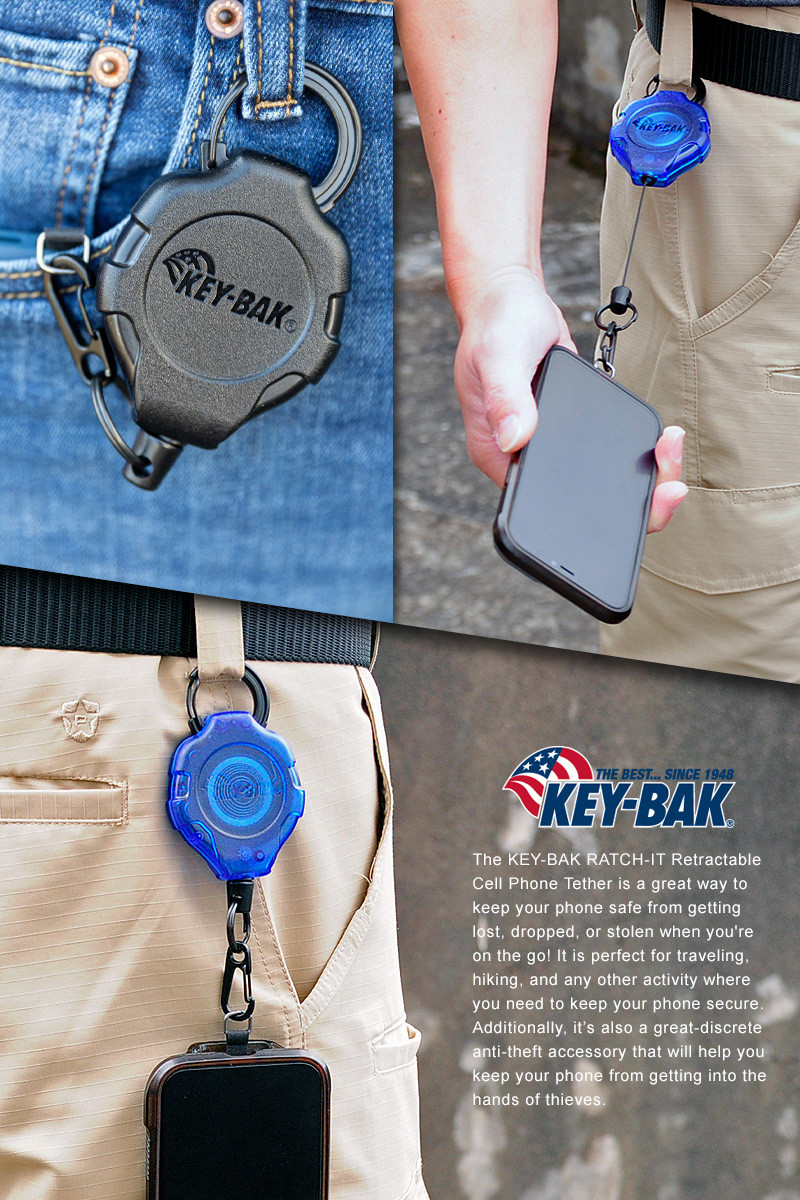 KEY-BAK RATCH-IT 可伸縮手機掛繩是外出時保護手機免遭遺失、跌倒或被竊的絕佳方式!它非常適合旅行、徒步旅行以及任何需要確保手機安全的場合。此外,它也是一款非常實用且隱密的防盜配件,可有效防止手機落入竊賊之手。