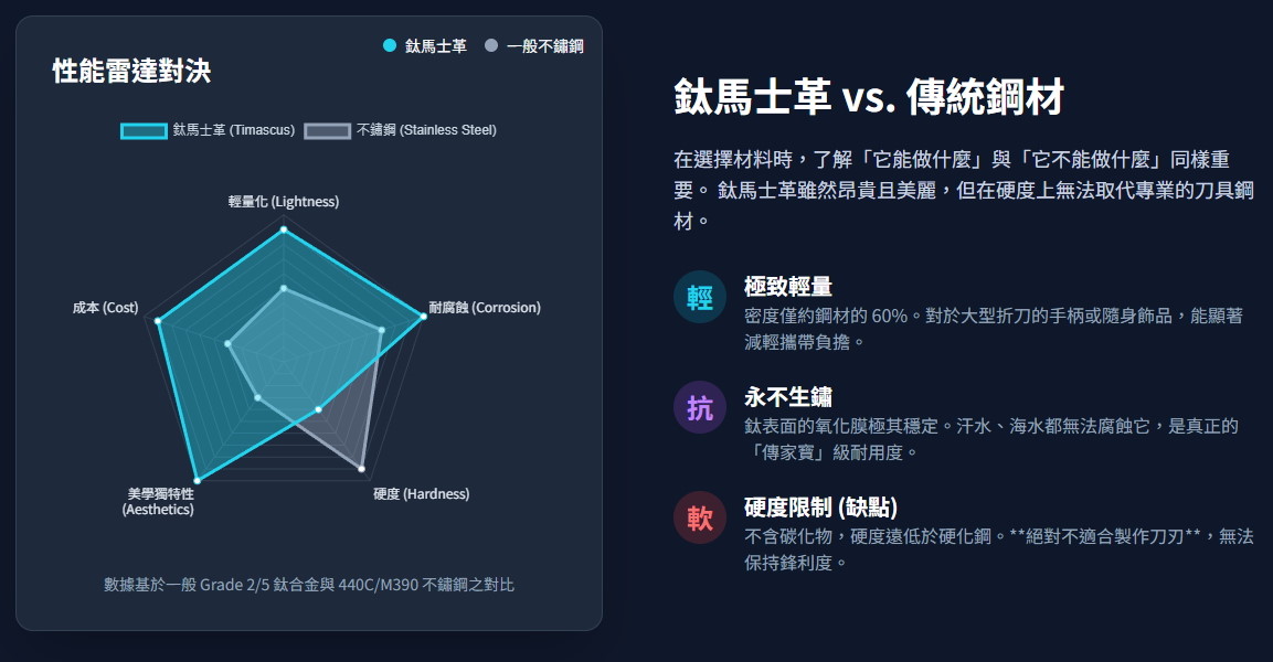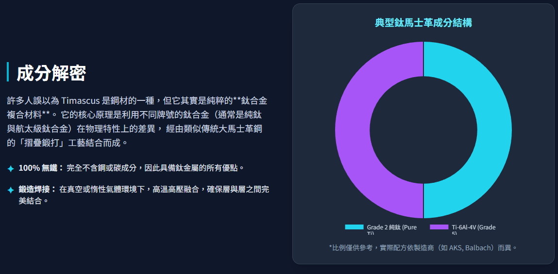 【什麼是鈦馬士革?】 鈦馬士革」(Timascus / Titanium Damascus),有時也稱為 Moku-Ti,是一種現代冶金技術產生的高階複合材料。雖然名稱中帶有「鋼」字,但它其實完全不含鐵或碳(鋼的成分)。