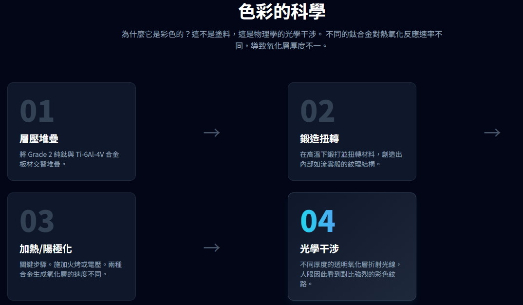 加熱(火烤)或陽極氧化: 當材料受熱或通電時,不同層次的鈦合金會因為氧化膜厚度不同,而顯現出截然不同的顏色(如紫、藍、金、青綠)。