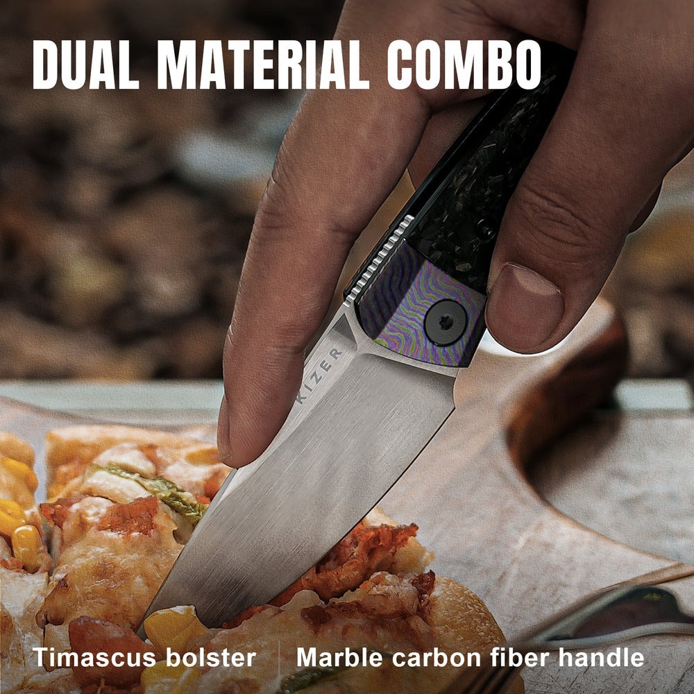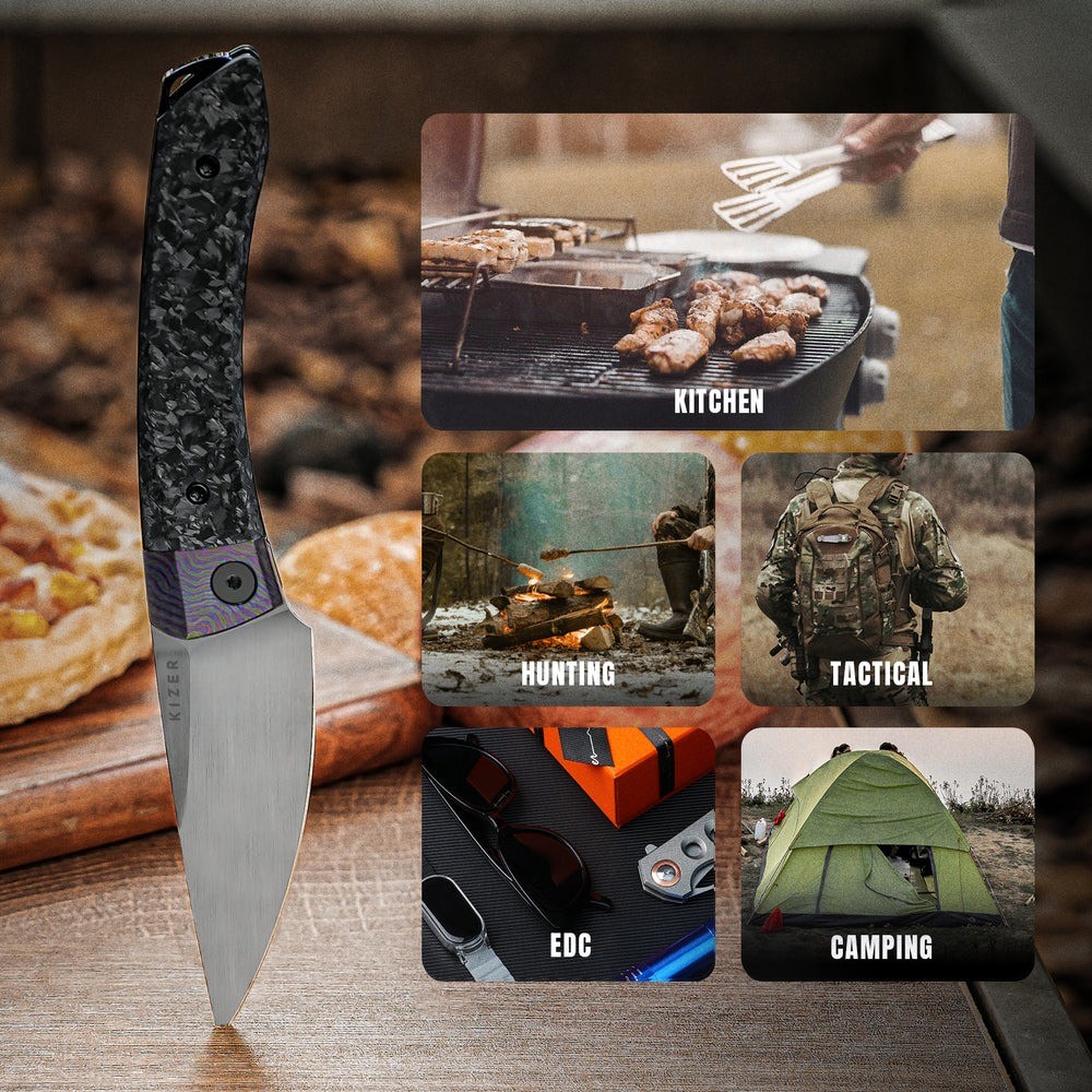 1.高品質材料: Kizer 使用優質材料,主要來自美國和日本。常用的刀片鋼材包括 CPM-S35VN、CPM S45VN、Bohler M390、CPM-20CV 和 154CM。刀柄材料通常包括鈦合金、碳纖維、G-10 和米卡塔。