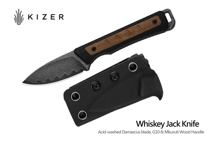 Kizer Whiskey Jack G10+Mkuruti木柄直刀黑酸洗Damascus鋼附kydex鞘
