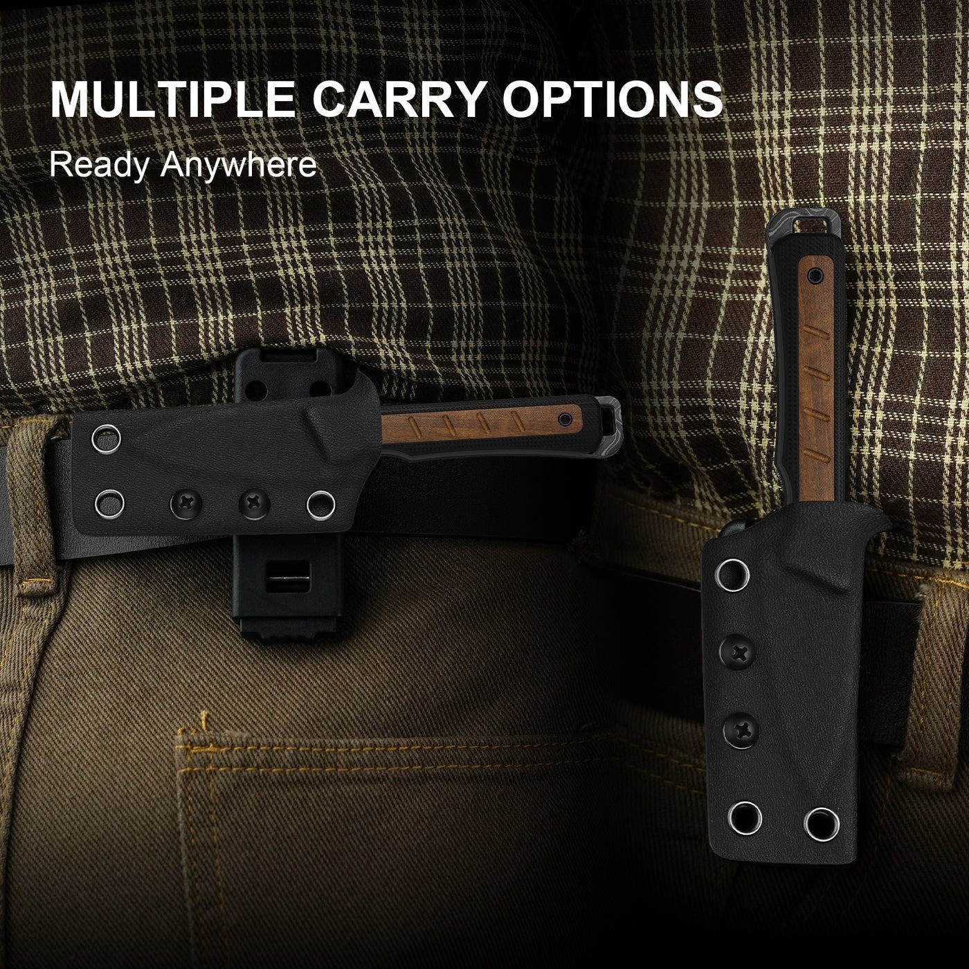 手柄採用高壓層壓G10玻璃纖維複合材料與柏克蘇木相結合,表面紋理設計增強了握持感。柏克蘇木的天然木香更添獨特韻味,而材質的巧妙融合則確保了手柄的耐用性和優雅美觀的設計。 多種攜帶方式