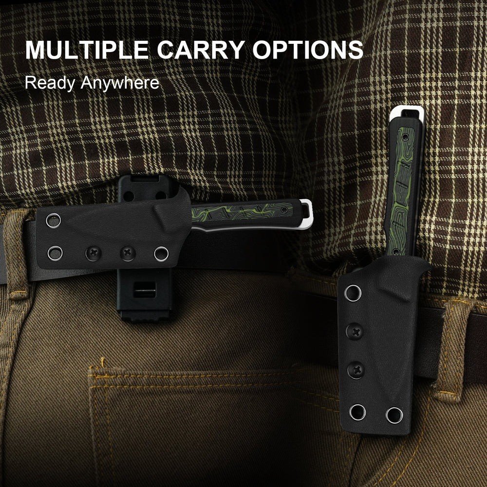 這款刀具可作為頸掛刀、靴刀或口袋工具使用,其多功能性可應付各種場合。耐用的Kydex刀鞘確保持久保護,其可調節的固定係統支援多種攜帶方式:水平、垂直,或固定在背包、腰帶或手臂上。它還相容於MOLLE系統,可輕鬆連接到戰術包或裝備上,無論您的冒險之旅將您帶到何處,都能確保安全穩定的攜帶。