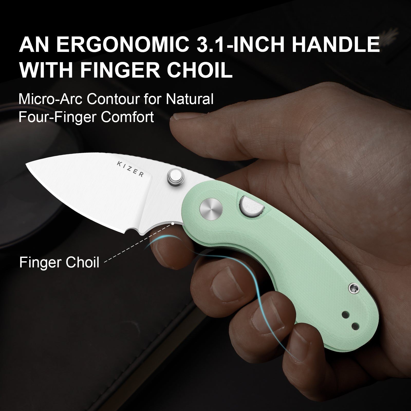 手把採用仿生微弧形設計,完美貼合手部自然握持姿勢。刀刃根部的關鍵指槽可穩固支撐食指,確保四指完全貼合,握持穩固舒適。此設計提供卓越的操控性和舒適度,即使在長時間或需要精細操作的情況下,也能有效減輕手部疲勞。