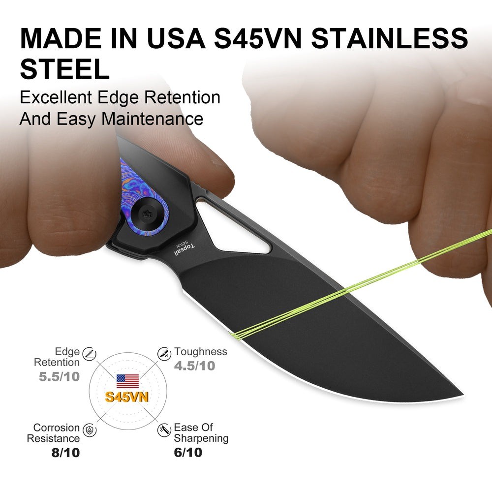 這款刀刃採用高端粉末冶金鋼 S45VN 不銹鋼製成,兼具出色的刀刃保持性、耐用性和防銹性。它是日常攜帶刀具和戶外使用的理想材料,即使在嚴苛的任務中也能保持鋒利,同時易於維護。