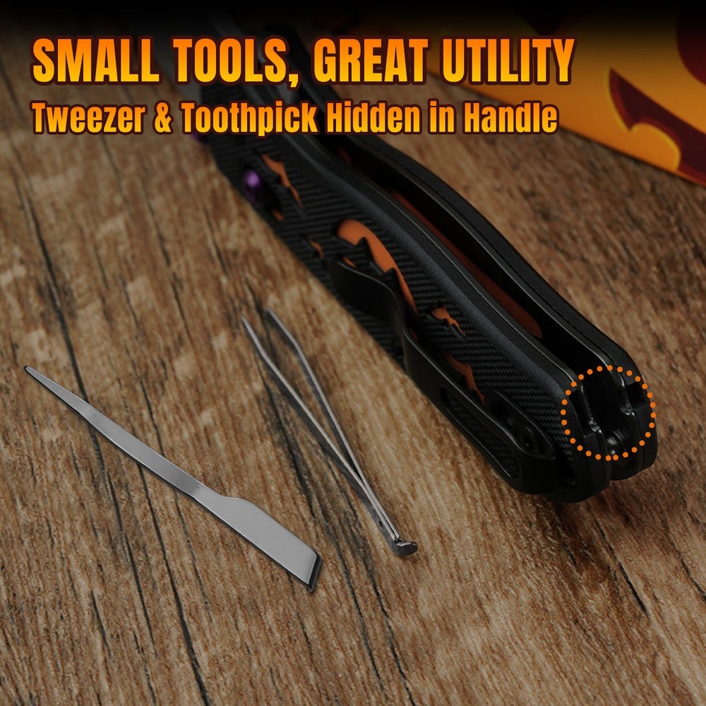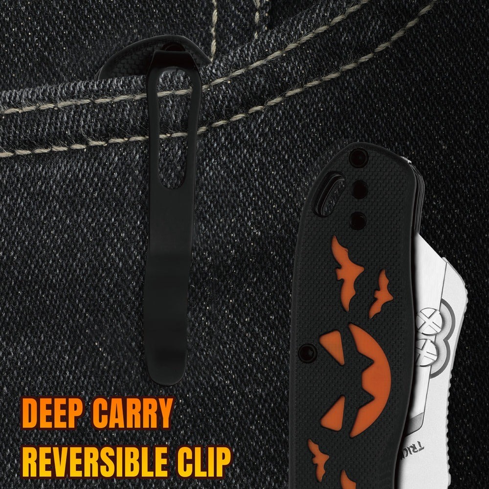 Kizer Uti BEAR 1 V3619JHW1 萬聖節版是一款集實用功能與驚艷外觀於一身的收藏級刀具。黑橙配色搭配流線型銀色刀刃,使其在任何收藏中都脫穎而出。刀刃採用 50CrMoV15 鋼材打造,刀刃光滑,經久耐用,耐腐蝕。刀刃硬度高達 57-58 HRC,刀刃鋒利,品質可靠。