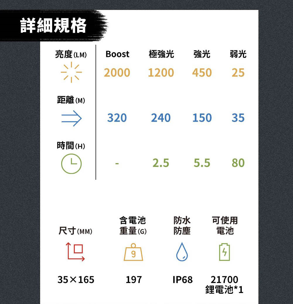 ●中等功率,450流明,150公尺射程,持續5.5小時