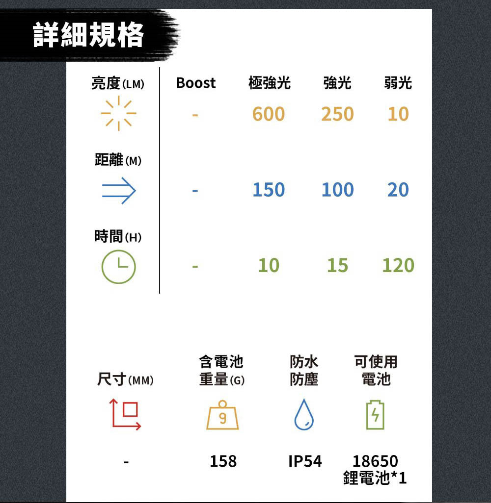 ●標準功率 600 流明,照射距離 150 米,持續 10 小時