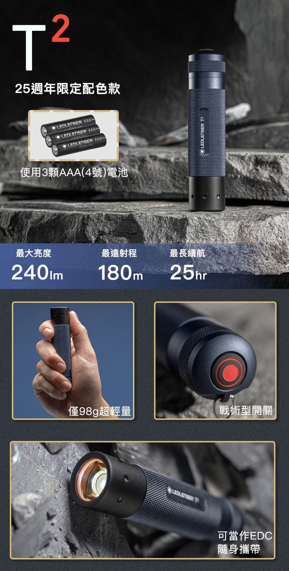 為慶祝25年來在照明領域的開拓創新,我們重新設計了三款最具代表性的產品:P7R手電筒、H8R頭燈和T2戰術手電筒。每款25週年紀念版均為限量發售,並享有專屬的25年保固,充分體現了Ledlenser產品一貫的耐用性、卓越品質和可靠性。