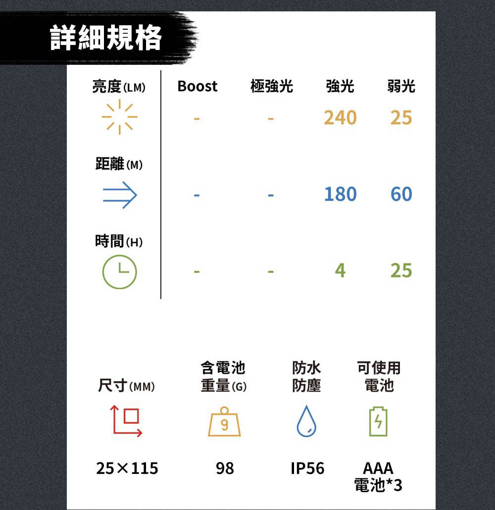 ●標準功率 240 流明,照射距離 180 米,持續 4 小時