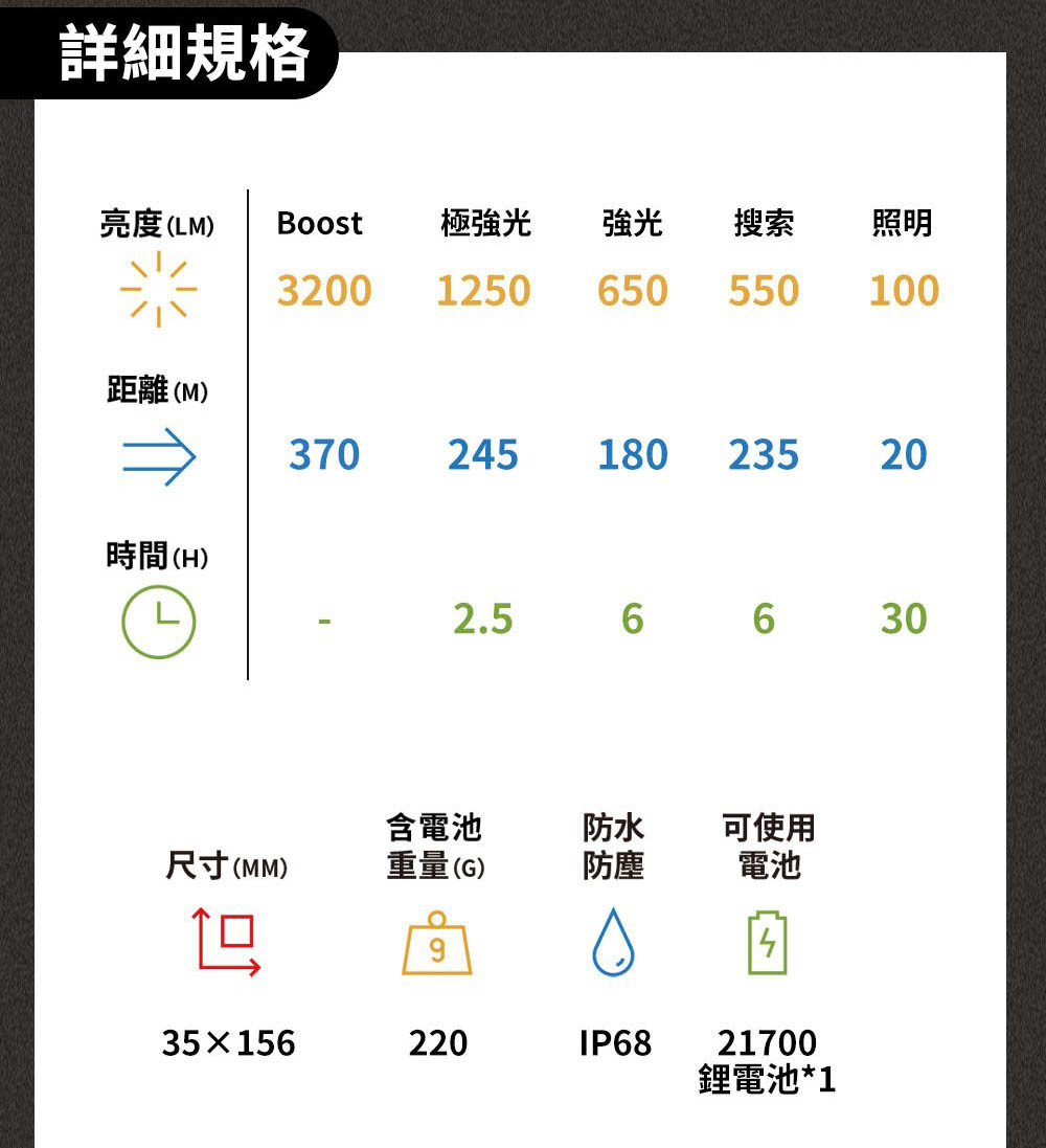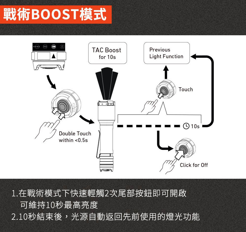 ●TAC 增強模式 - 3200 流明,370 公尺射程,在最需要的時候提供短時間的最大功率爆發