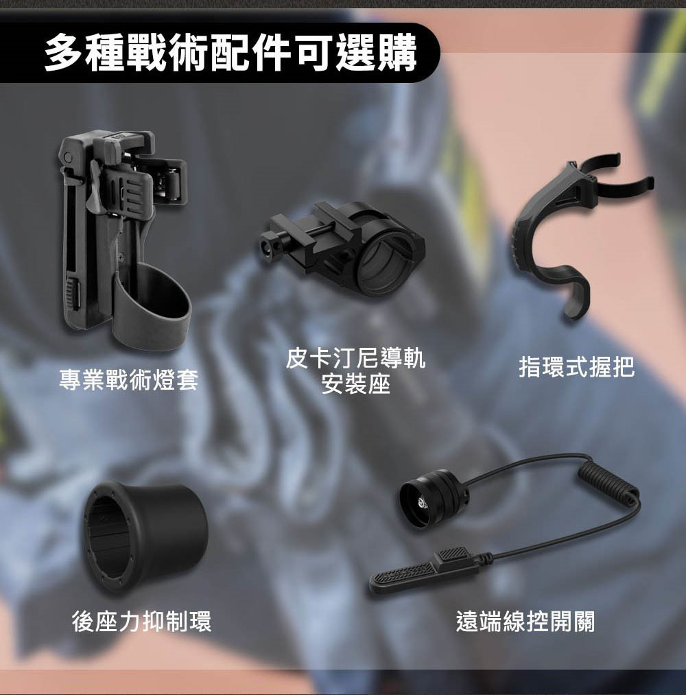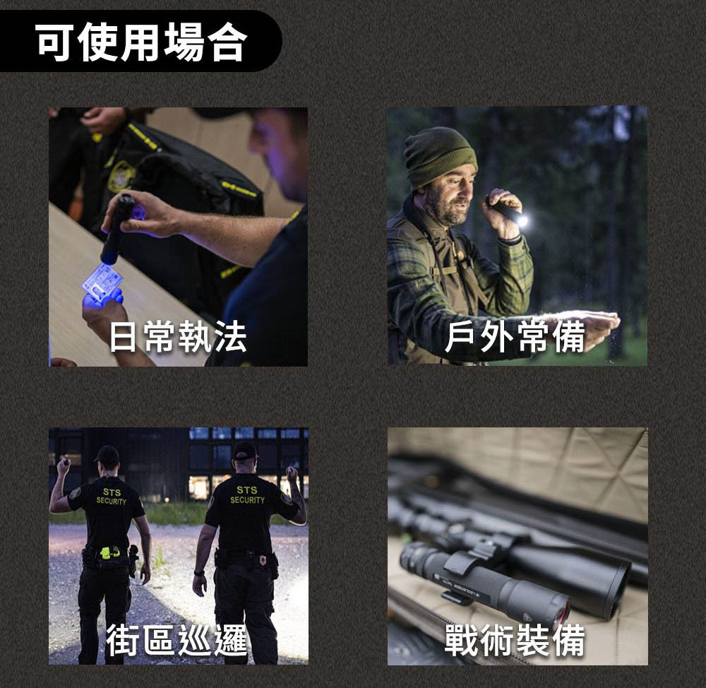 ●進階照明模式:搜尋、檢查、TAC 中光、TAC 高光、增強和頻閃,以適應不同的現場性能。