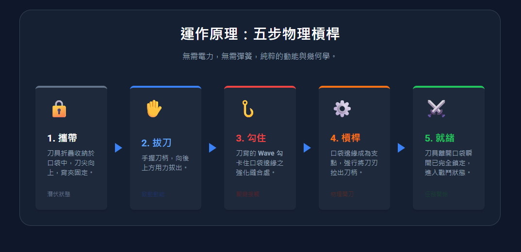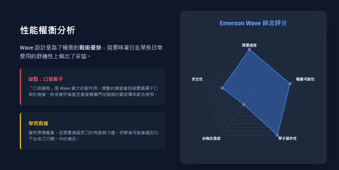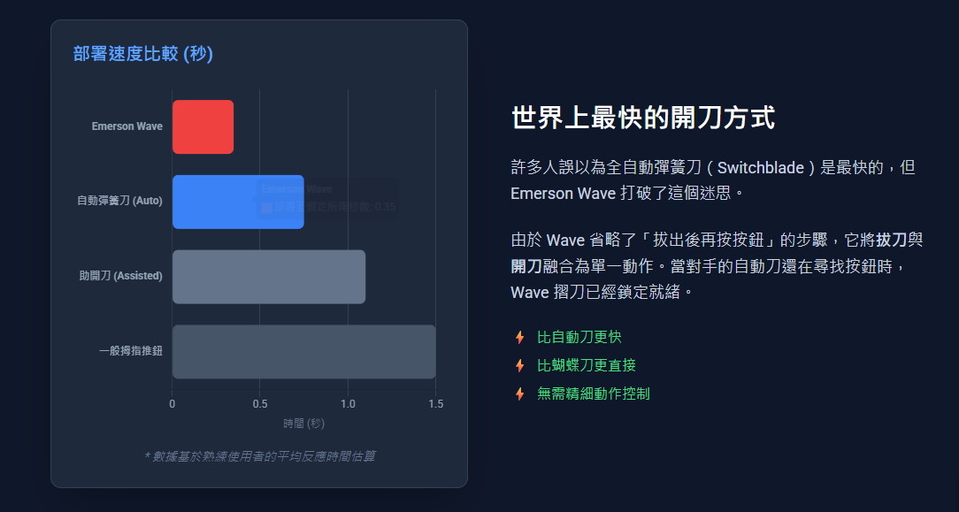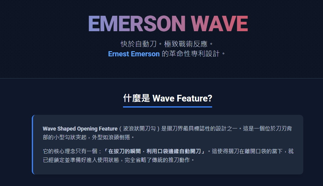 1.Emerson Wave(快開鉤): 這是該刀的核心。當你從口袋拔出刀子時,掛鉤會摩擦口袋邊緣自動彈開刀刃,是目前世界上最快的部署方式。