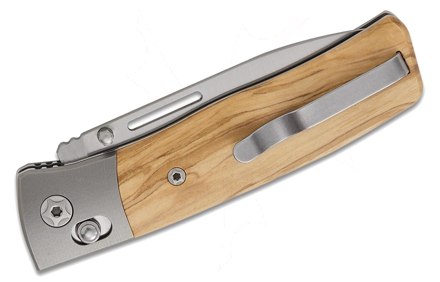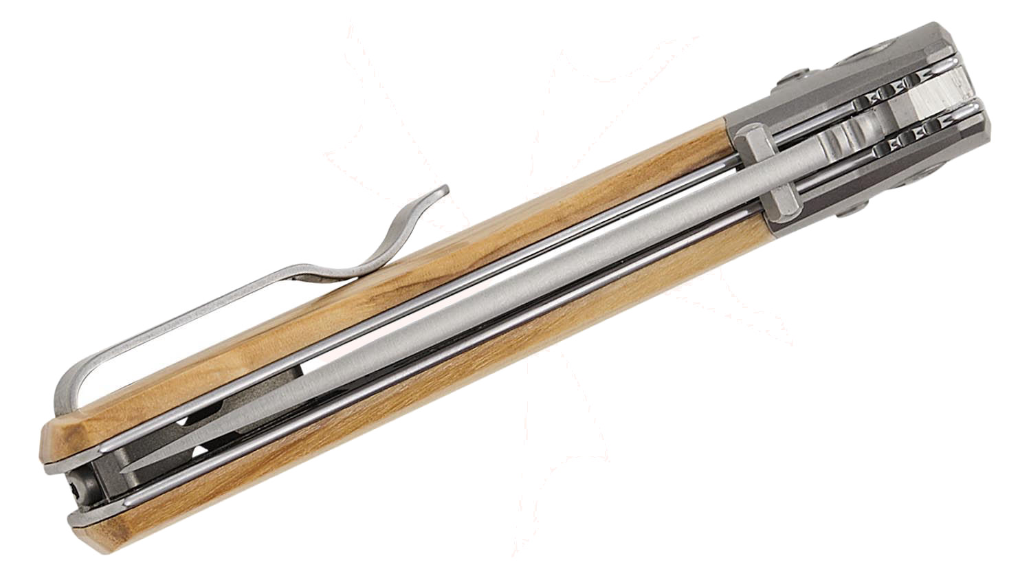 一種為搭配噴砂鈦金屬 Bolster(前端護片),另一種則採用延伸式握柄設計,覆蓋拋光不鏽鋼內襯。口袋夾可左右互換,並固定於鈦合金間隔柱上,使其同時適合左右手使用者。
